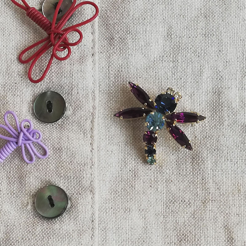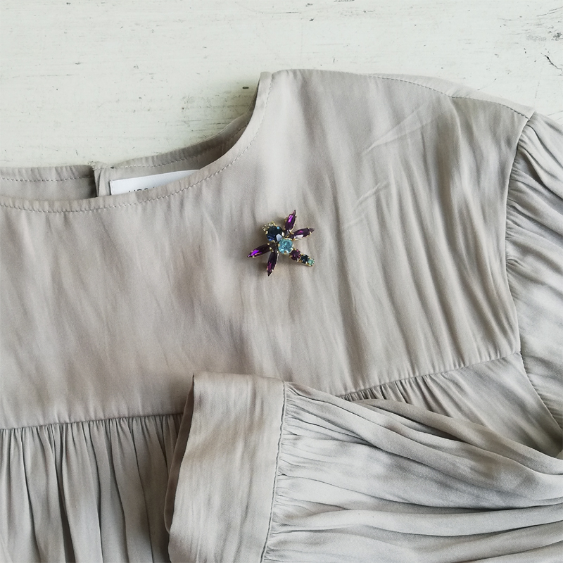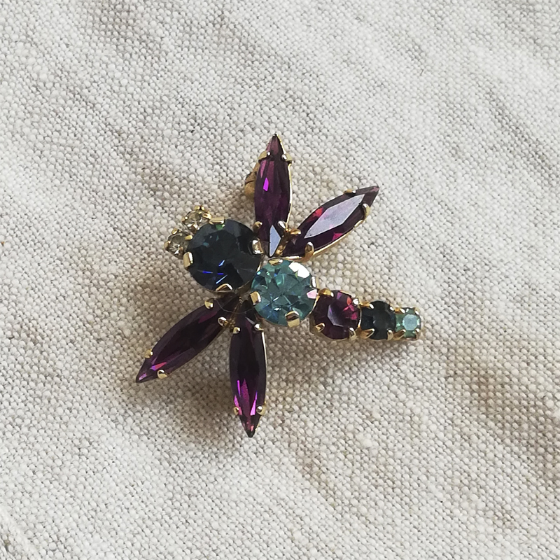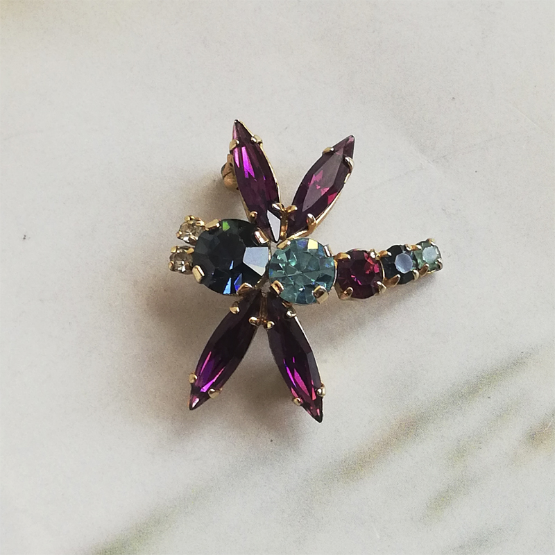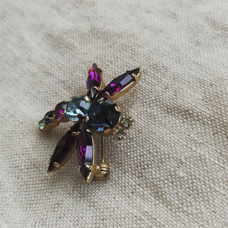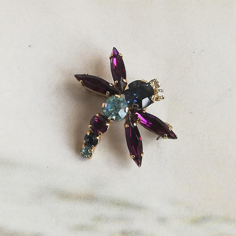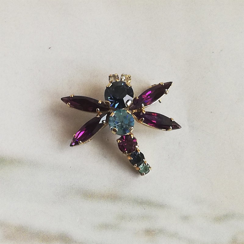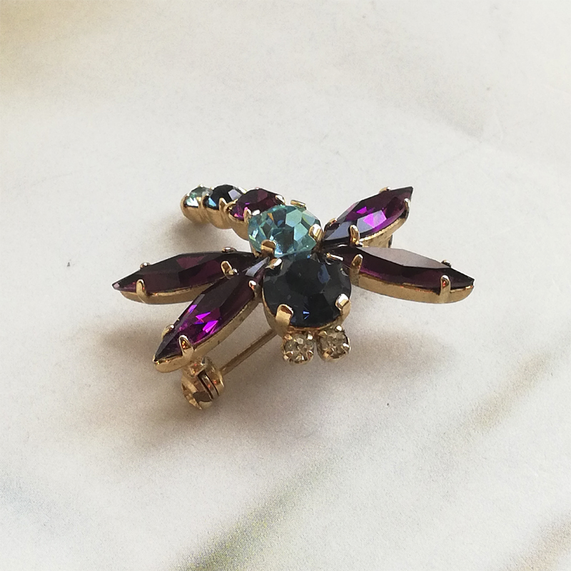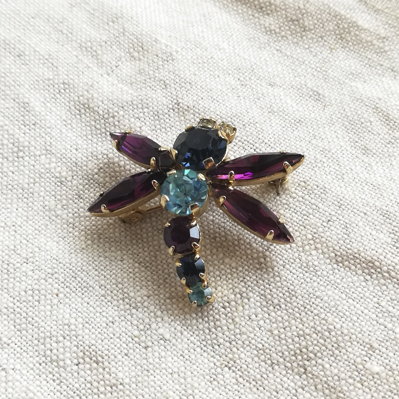 目はクリア、胴や羽に深みのあるパープルやブルーのガラスストーンが使われ、しっかりと爪留めされています。光や角度によって表情を変えるガラスの輝きが美しくチャーミングなブローチです。