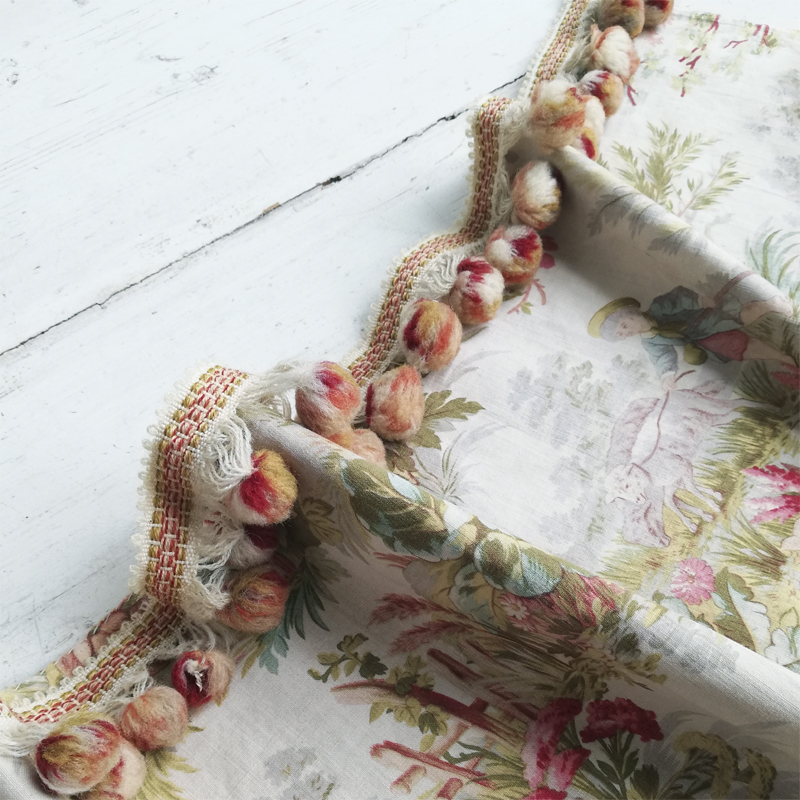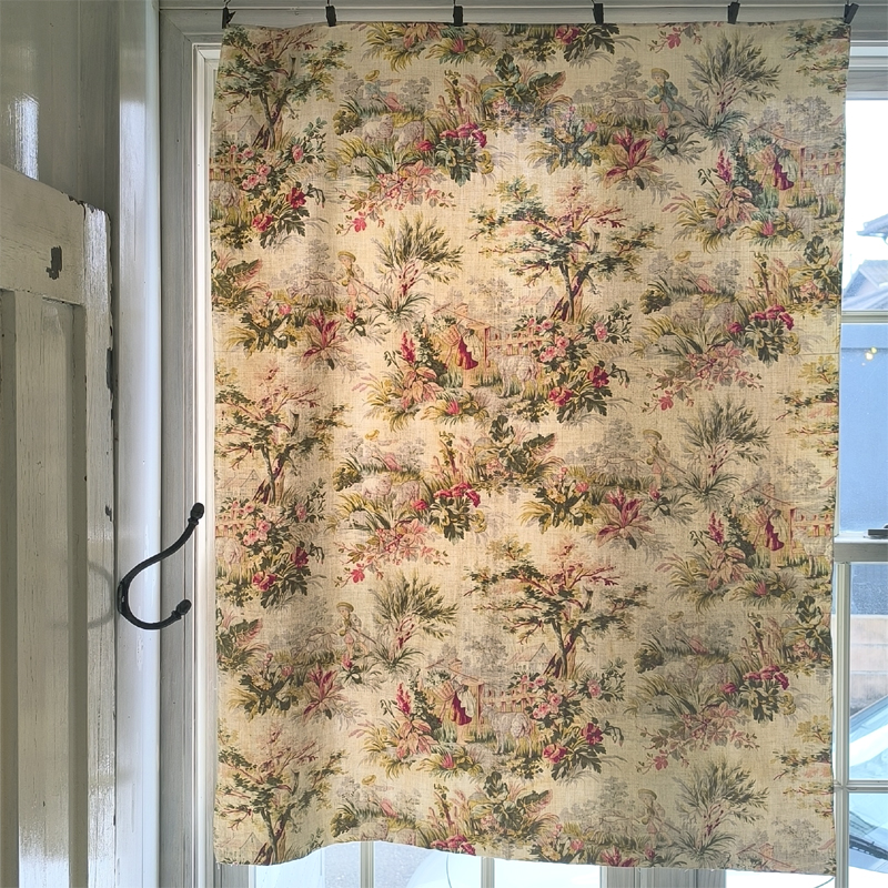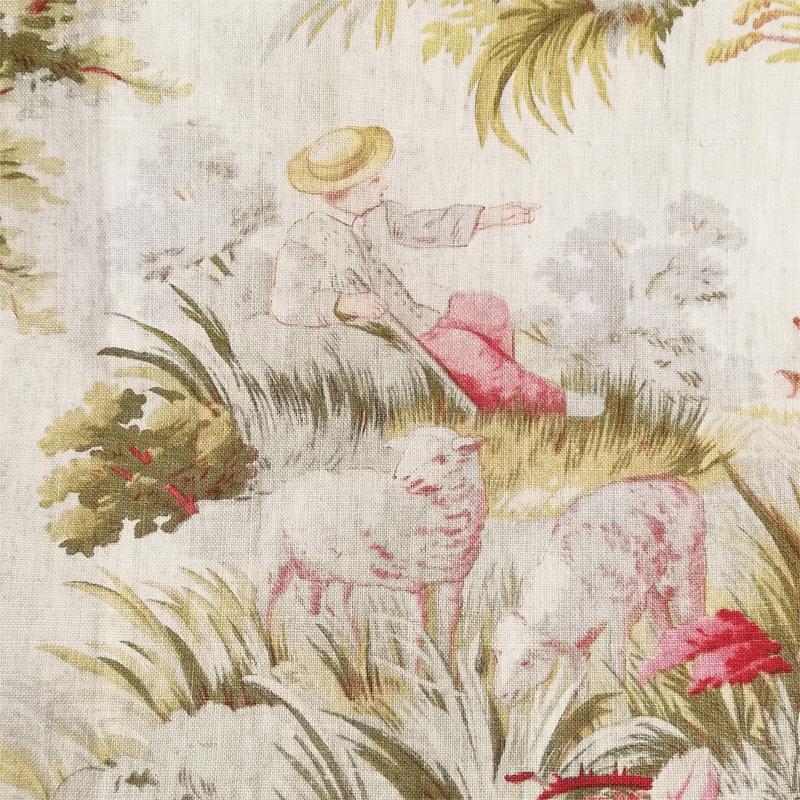 多色トワルドジュイと呼ぶとしっくりくる様な羊飼いの少年少女と木々や花々が描かれたファブリックです。