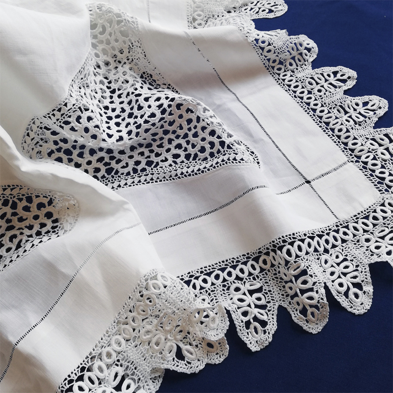張りのあるリネン地に角の無い三角形のようなクロシェレースのパーツを四箇所に入れたテーブルクロスです。クロシェレースは細いレース糸で丁寧に編まれています。
