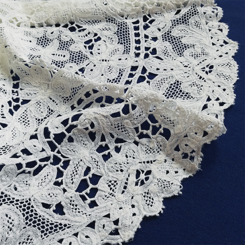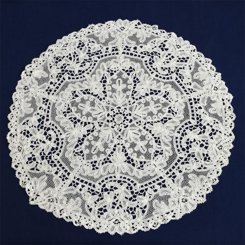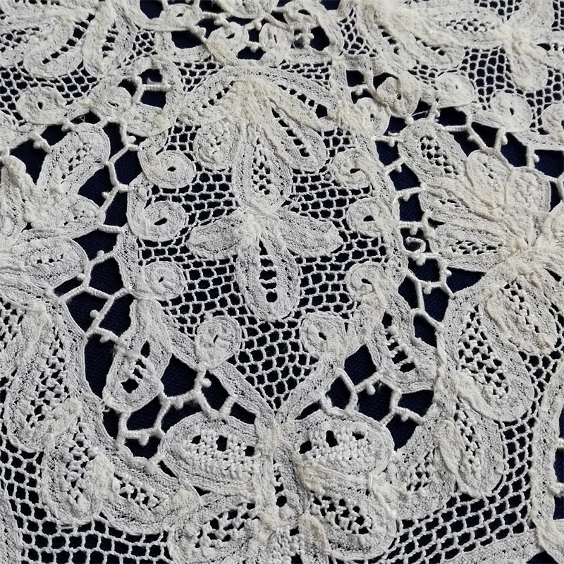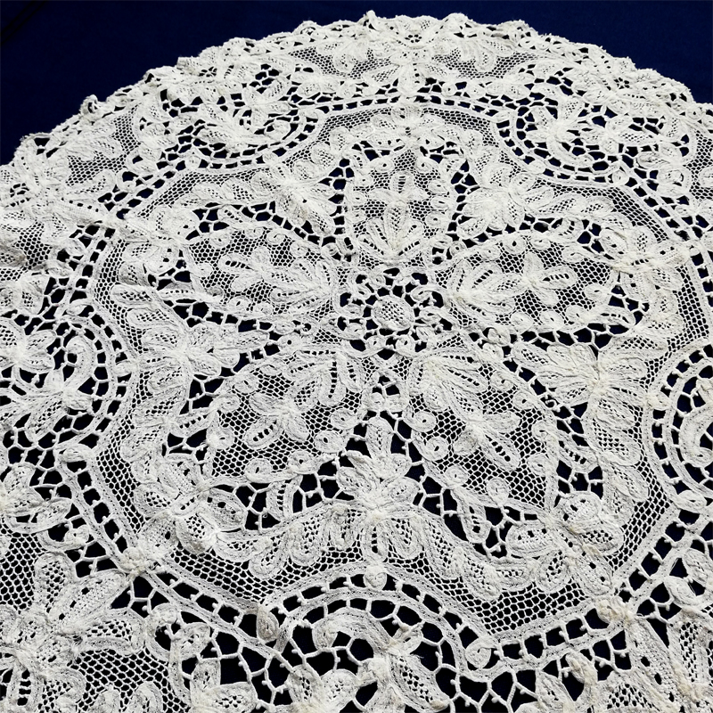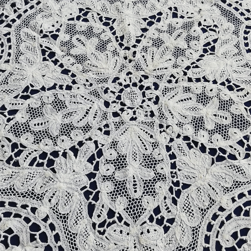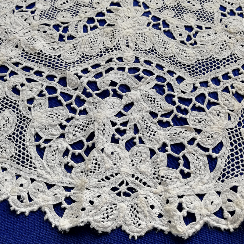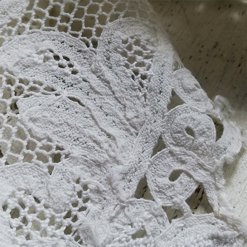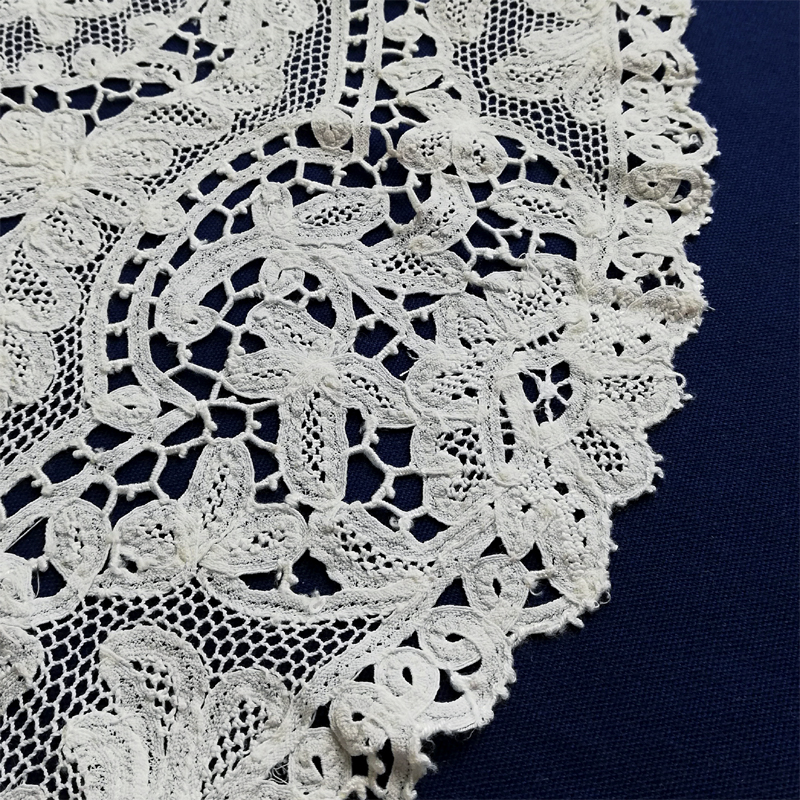 ボビンで編み上げた幅5ミリのテープレースをクルクルと植物や花の模様を作り、それをボビンレースで繋いでいく技法です。ドイツのエルツ山地にあるシュネーベルクという町で生まれたボビンテープレースと聞いています。細い糸で編まれた柔らかな風合いです。