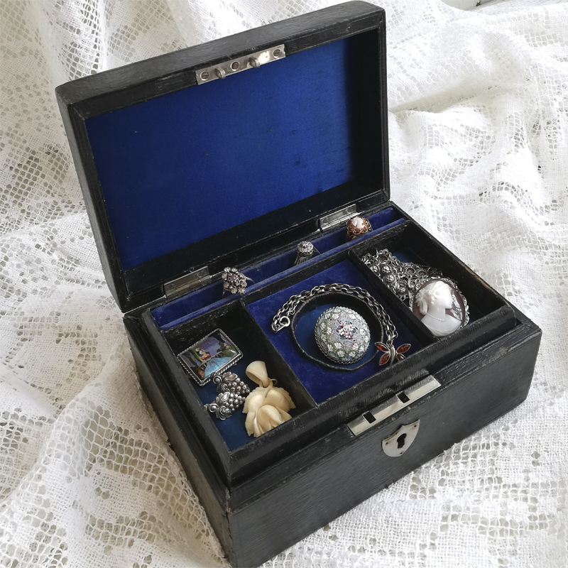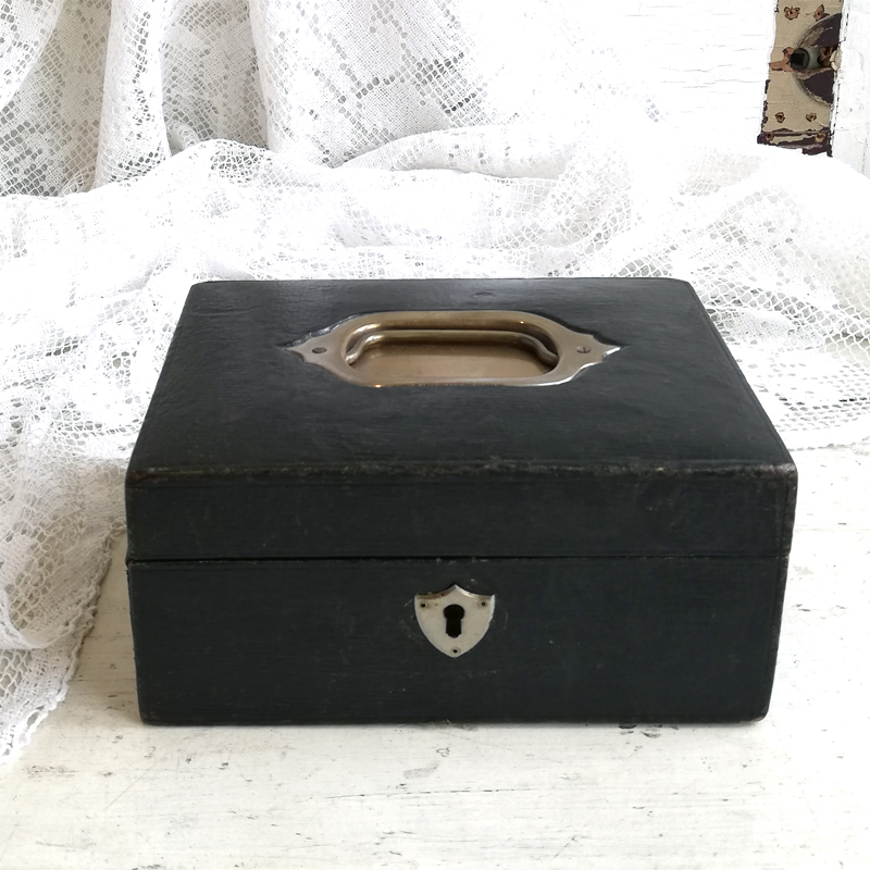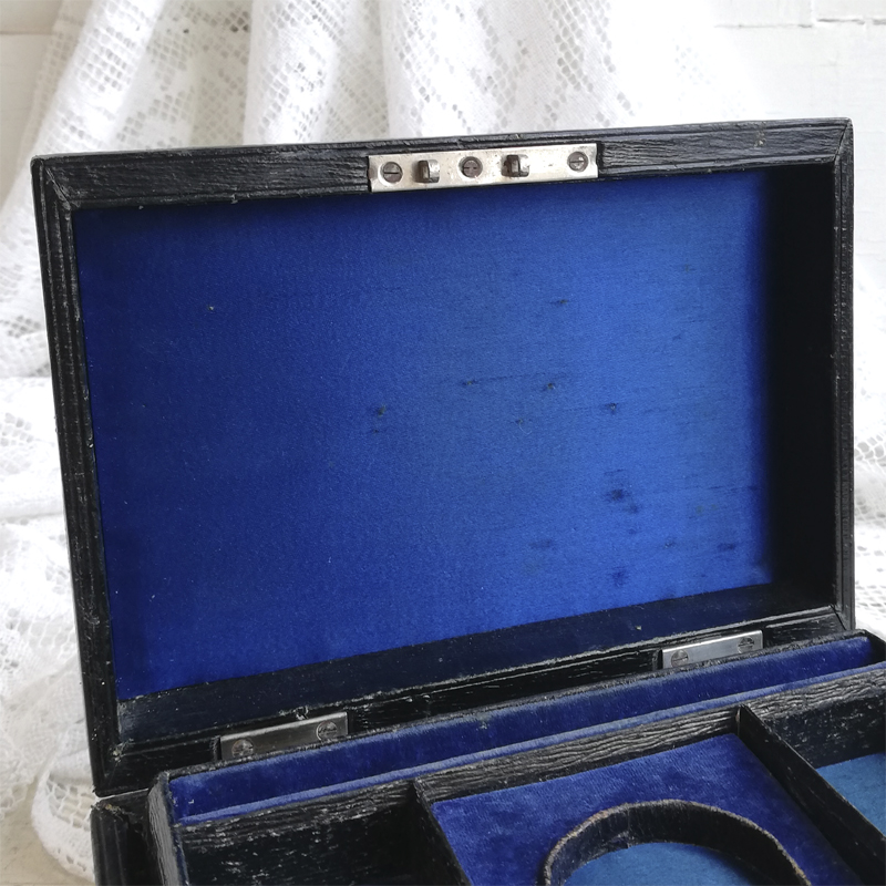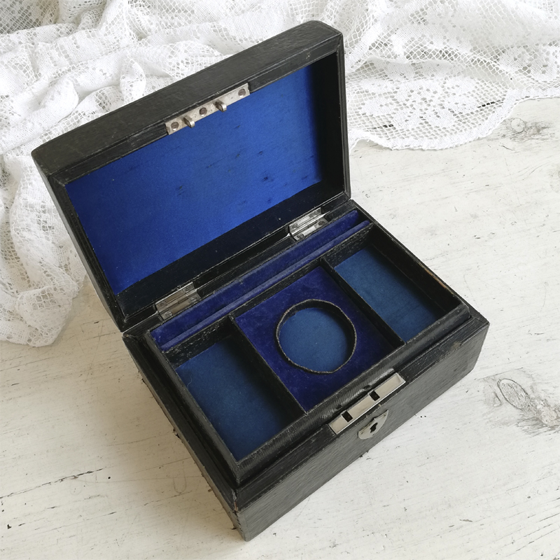 木製本体にブラックレザーで覆ったアンティークのジュエリーボックスです。