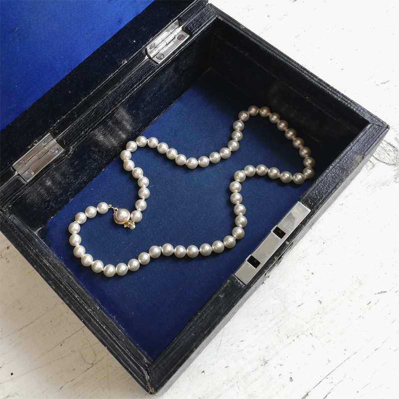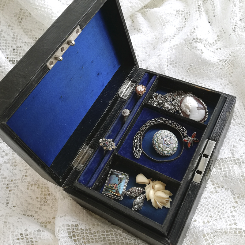 内側は深みのあるブルーのシルクとベルベットで覆われジュエリーが一層映えて見えます。