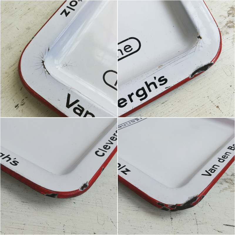 トレイの縁や角にホーローの欠けなどの傷みがあります。