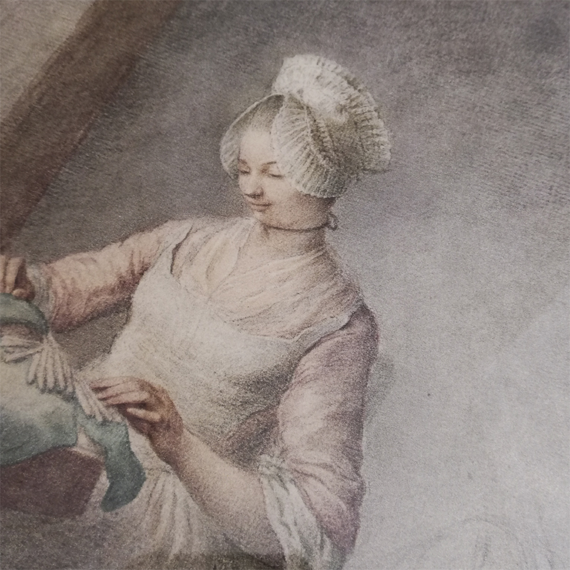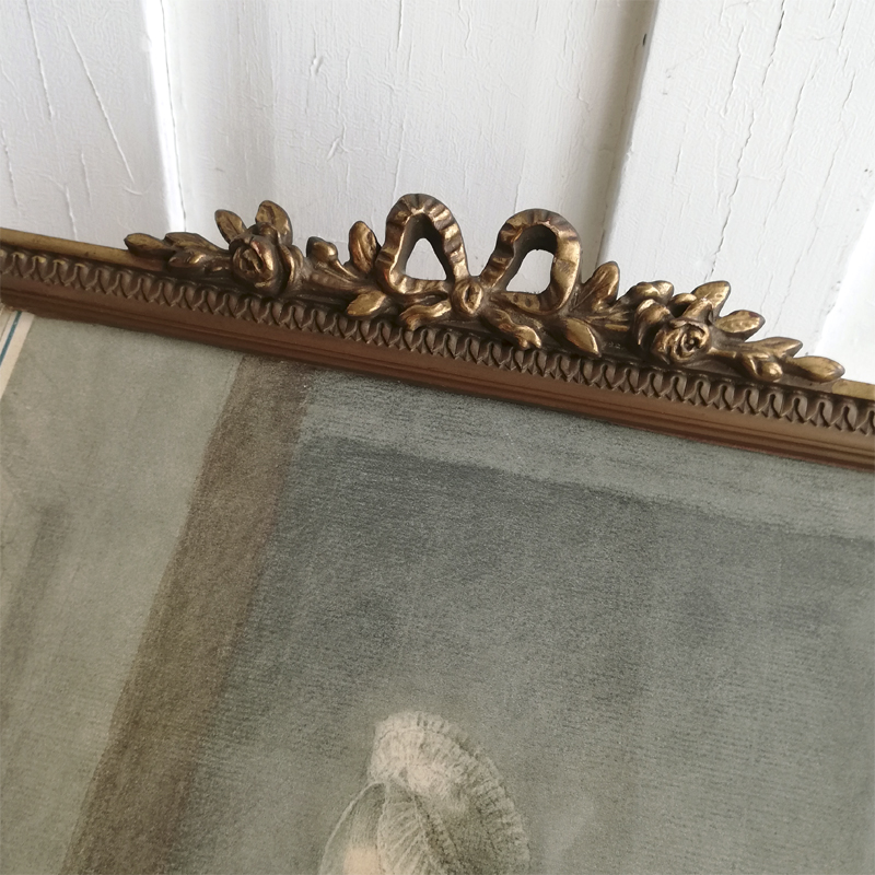 レースのボネを被り美しい笑顔でボビンレースを編む女性の復刻リトグラフリトグラフが入ったリボンと薔薇の装飾の額です。レースボネの繊細さや淡いピンクのブラウスの質感が伝わってくる美しい絵です。
