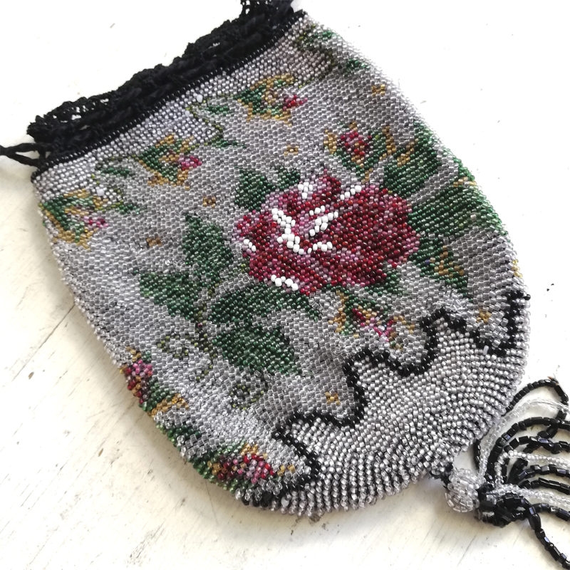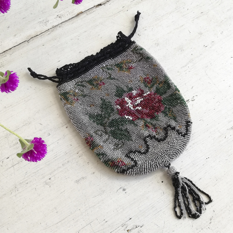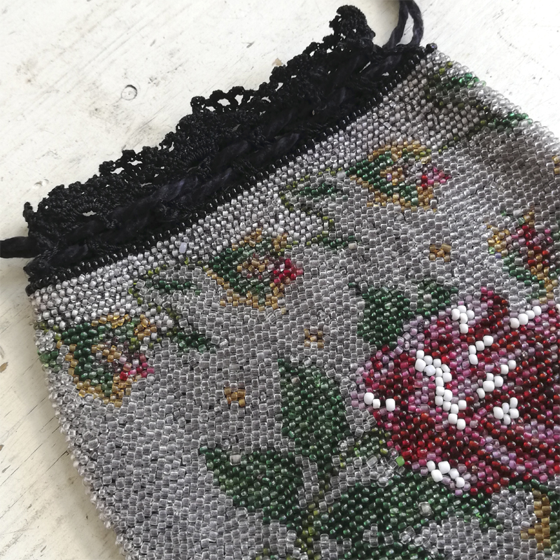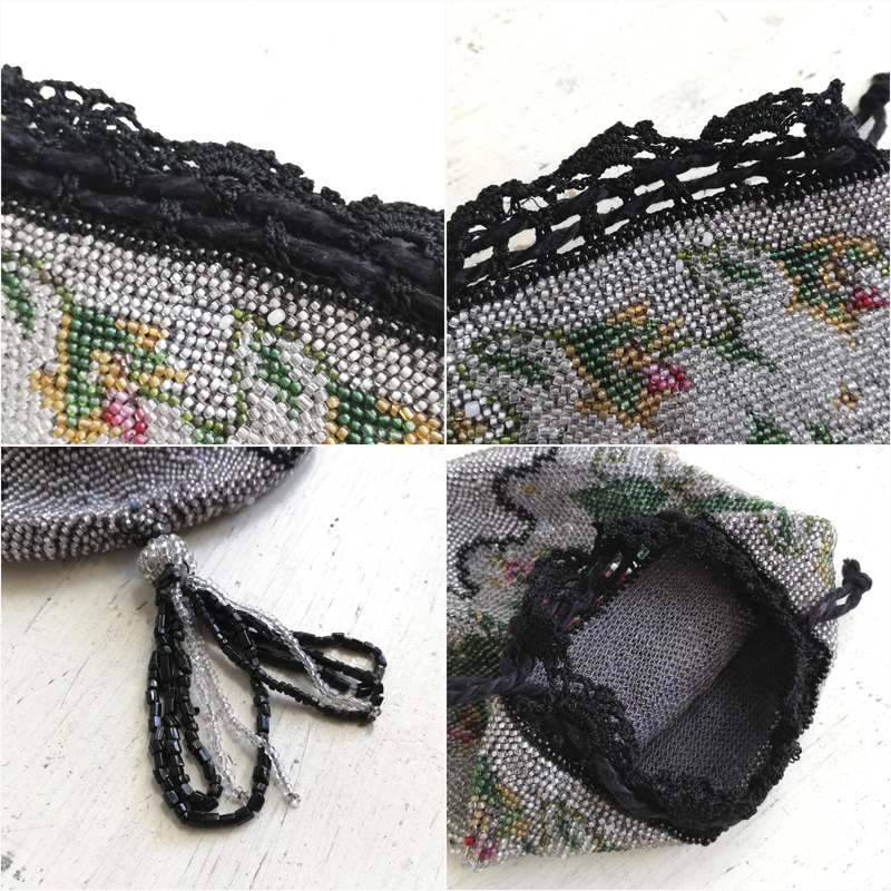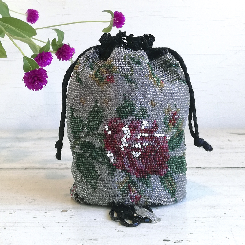 古い時代のビーズですので形や大きさは不揃いですが、花びらや葉には特に小さい1.3ミリ程のビーズが使われています。