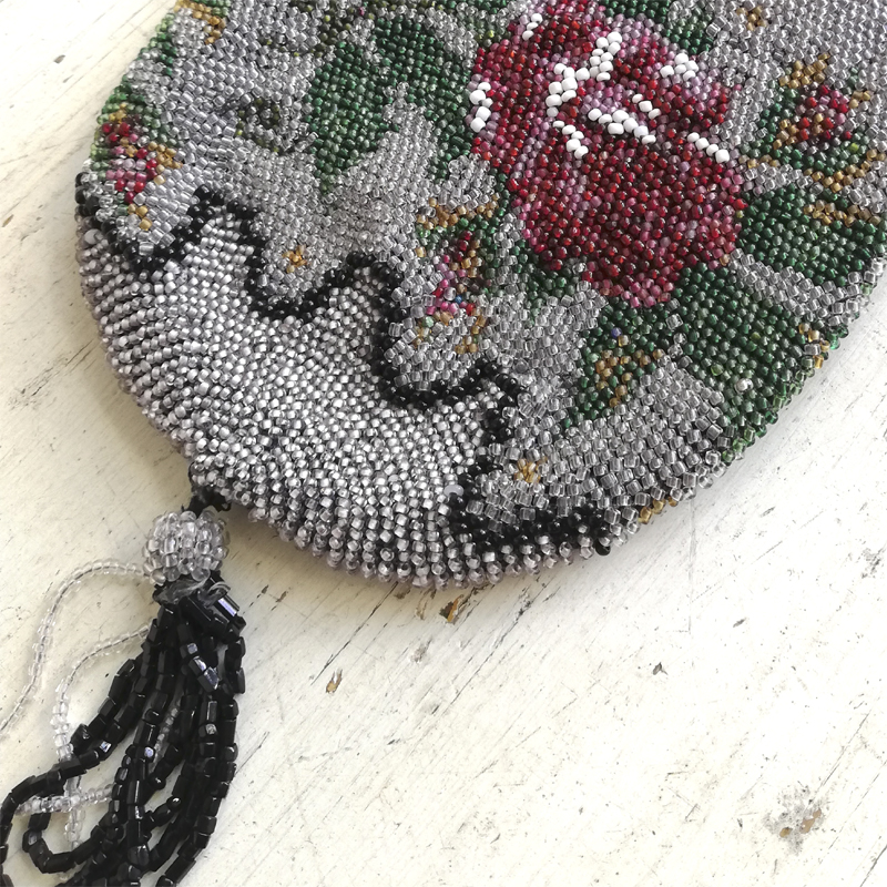 薔薇以外のベースはクリアビーズが使われていますが土台布がグレーですので、仕上がりの色もグレーに見えます。ビースの輝きもありますのでシルバーっぽく見えるのも綺麗です。