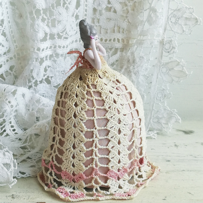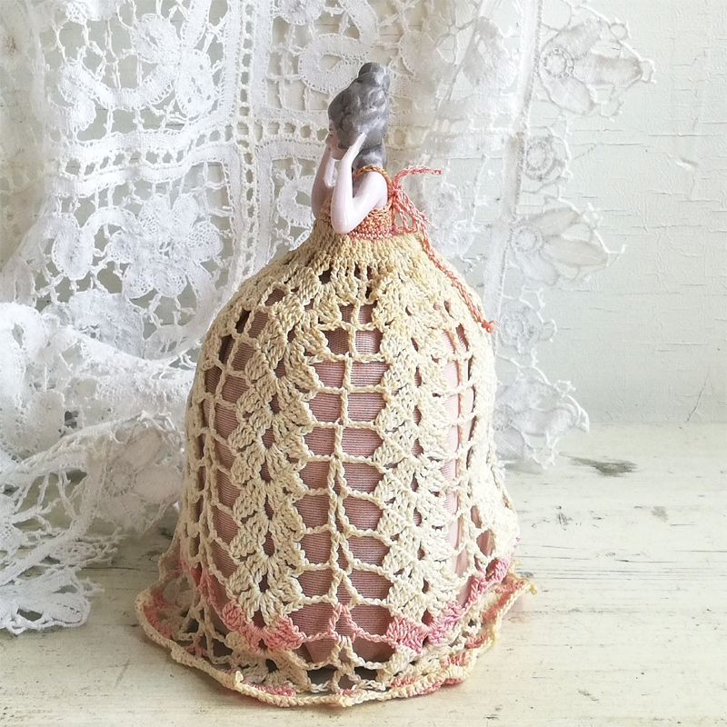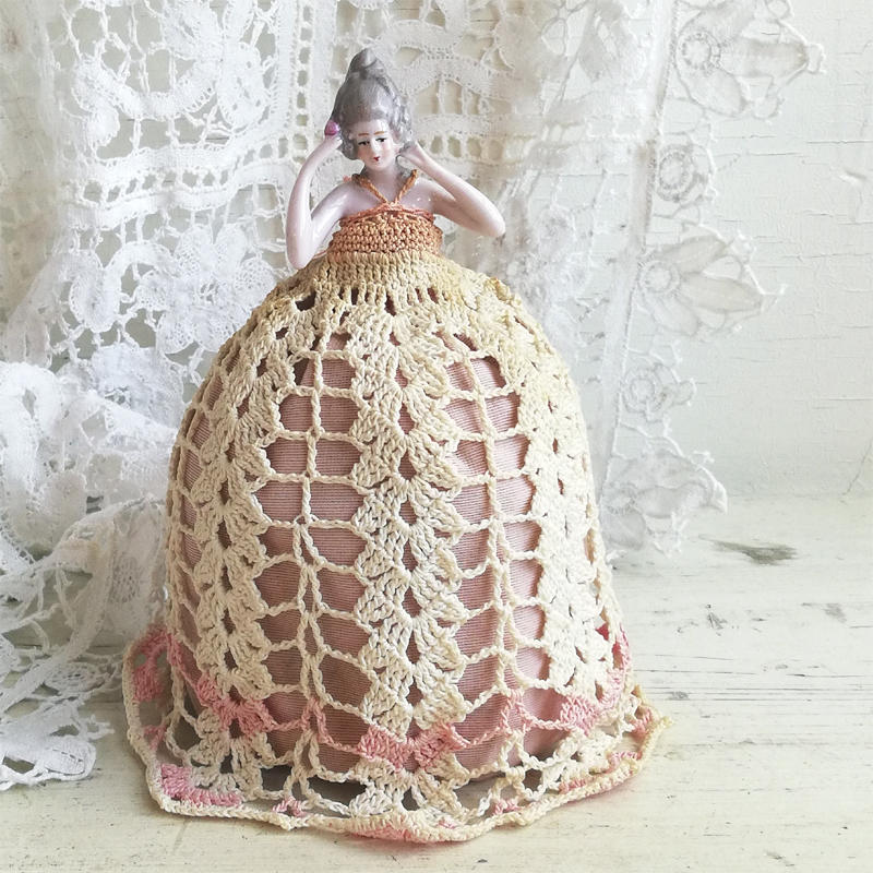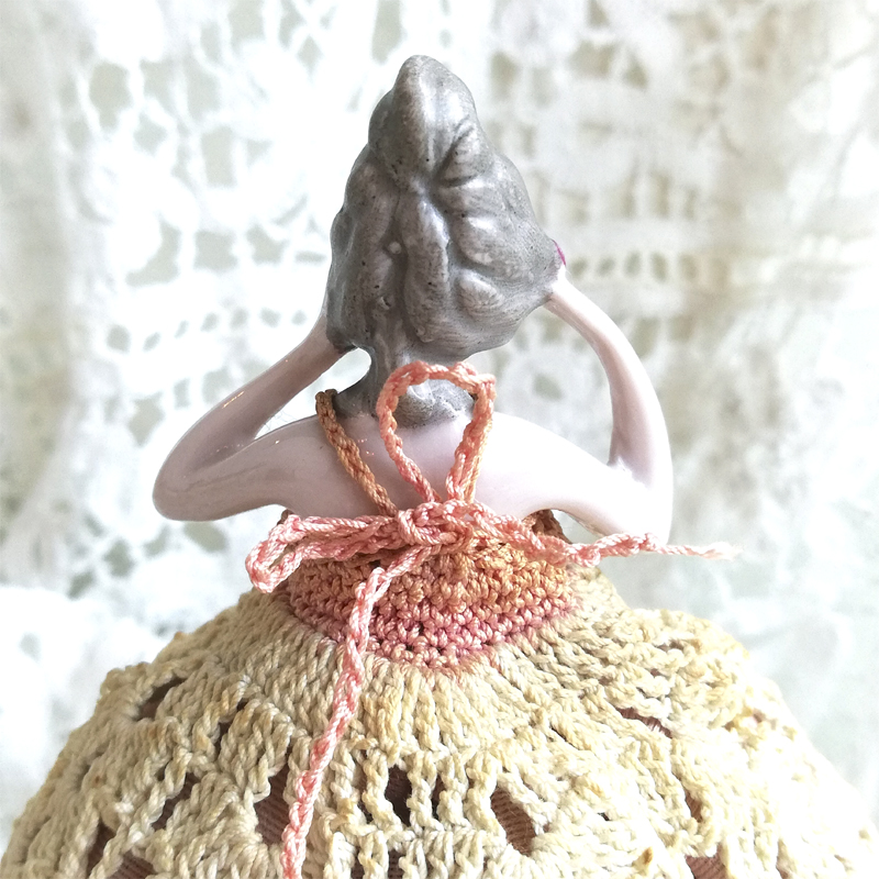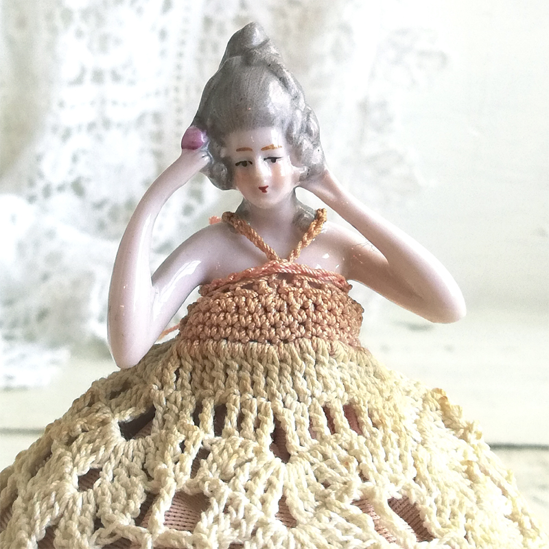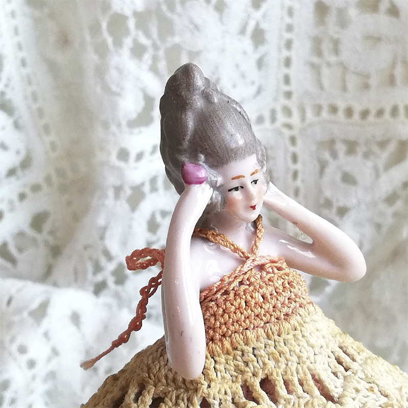 高く結い上げた髪と手の表情が美しいハーフドールのピンクッションです。
