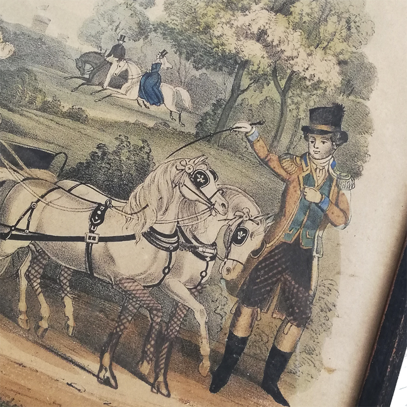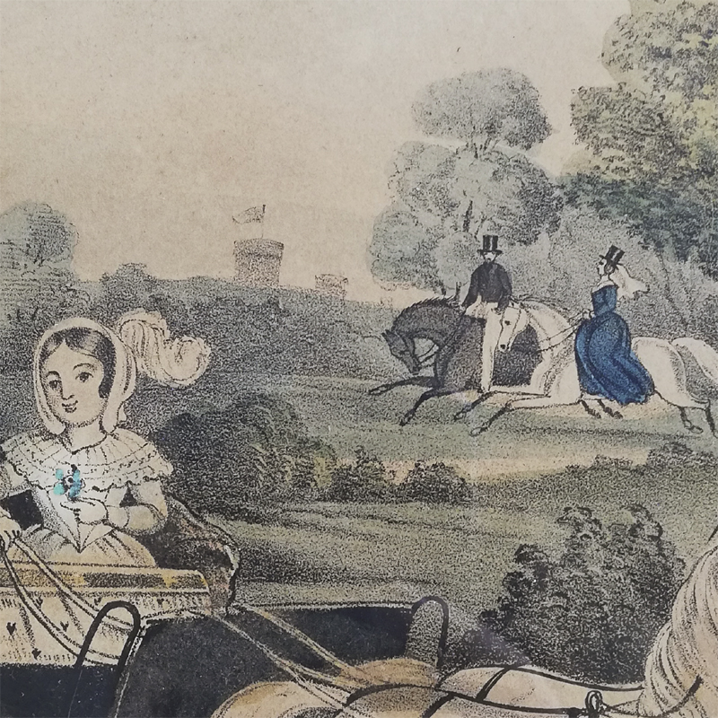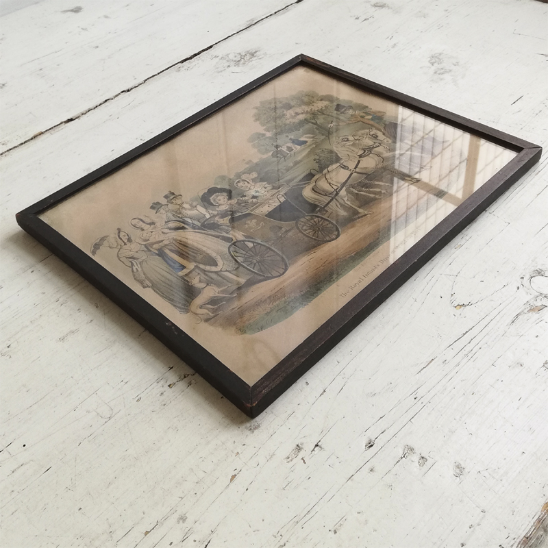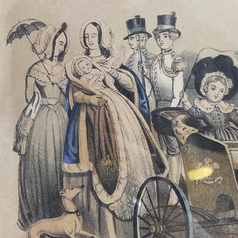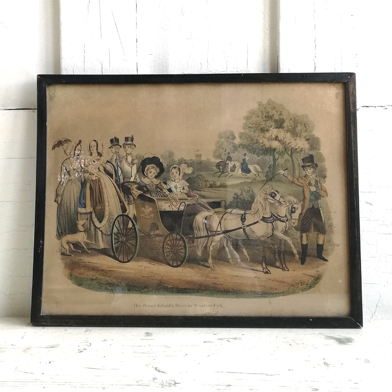 版画に薄く手彩色が施され当時のほのぼのとしたロイヤルファミリーの日常が垣間見れる作品です。