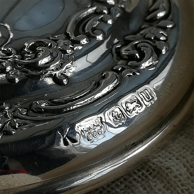 台座のエッジにW.J.Myatt & Coのメーカーズマーク、バーミンガムのアセイオフィスマーク、スタンダードマーク、1919年のデイトレターが入っています。