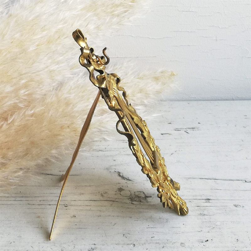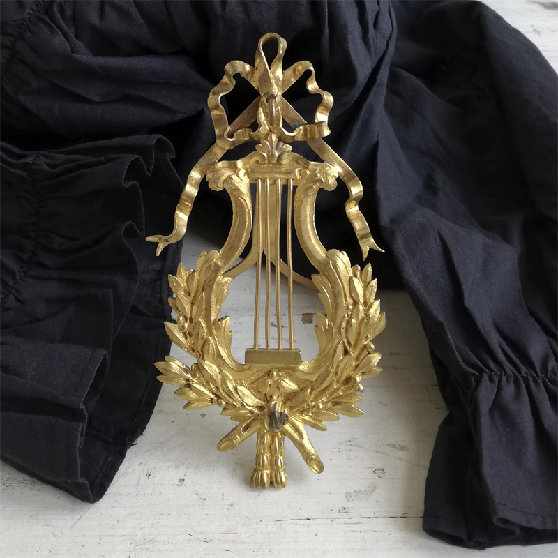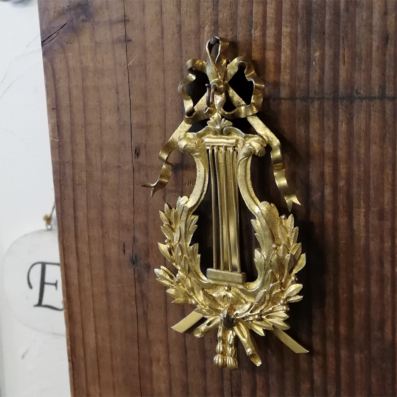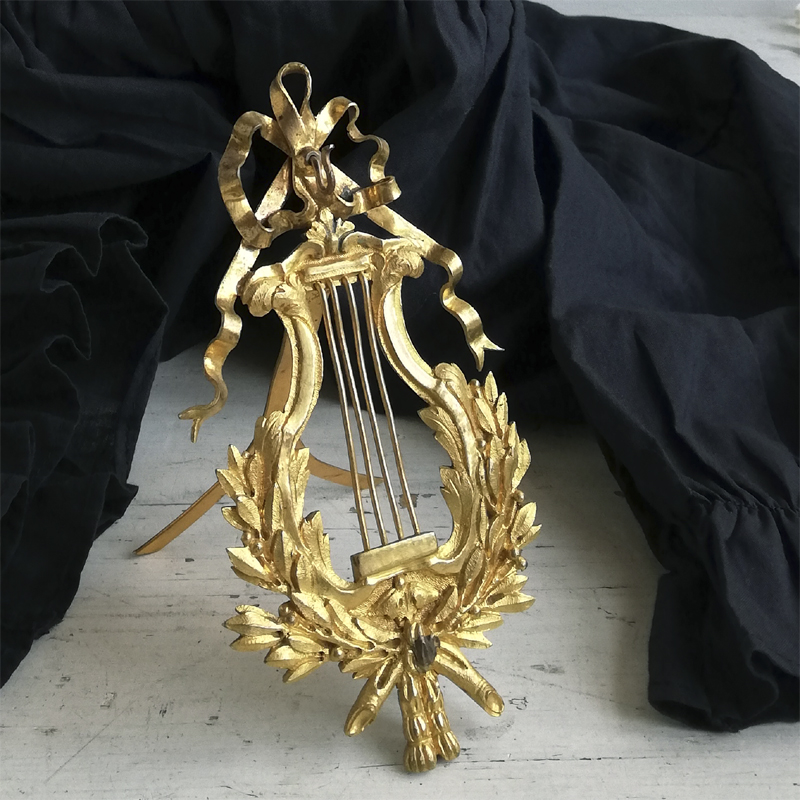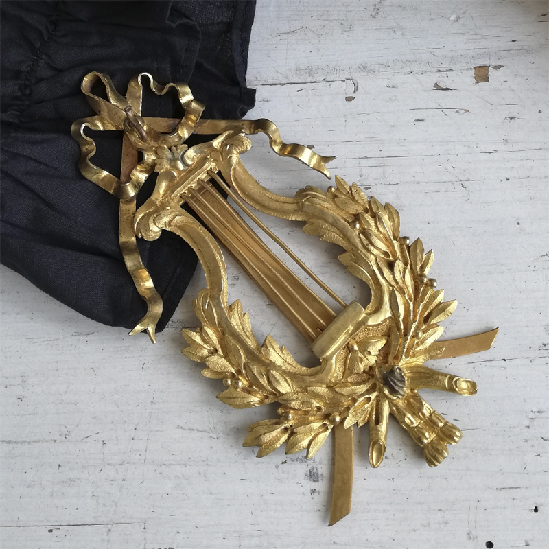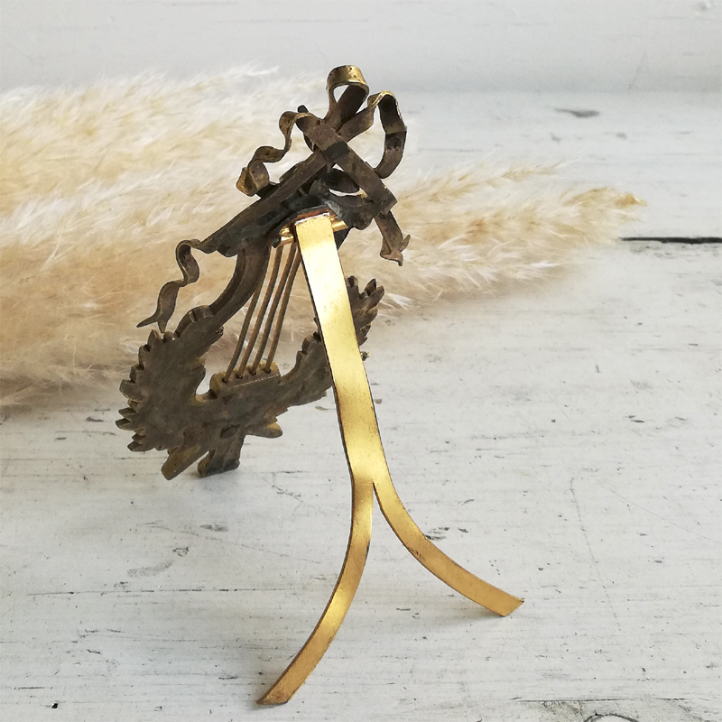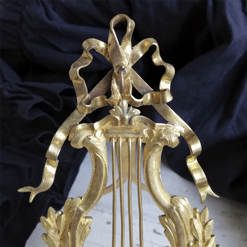 竪琴のリラにリボンと月桂樹を飾った優雅なブロンズの懐中時計ホルダー。
