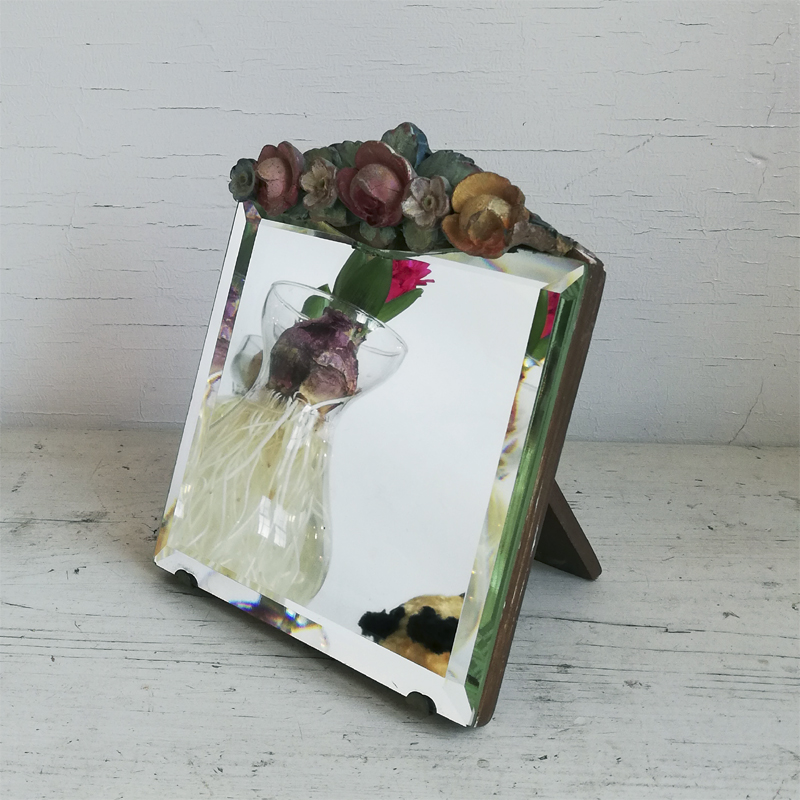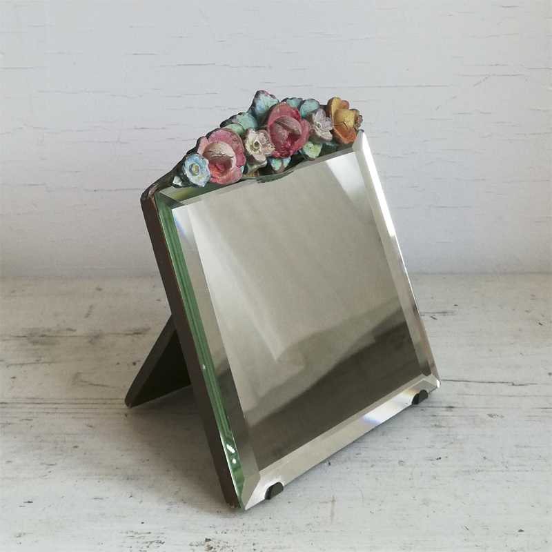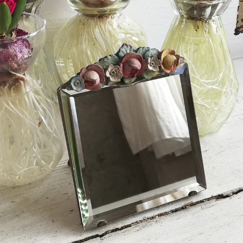 こちらはパステルカラーの薔薇や勿忘草が並んだバーボラで飾られたスクエアの小ぶりなミラー。