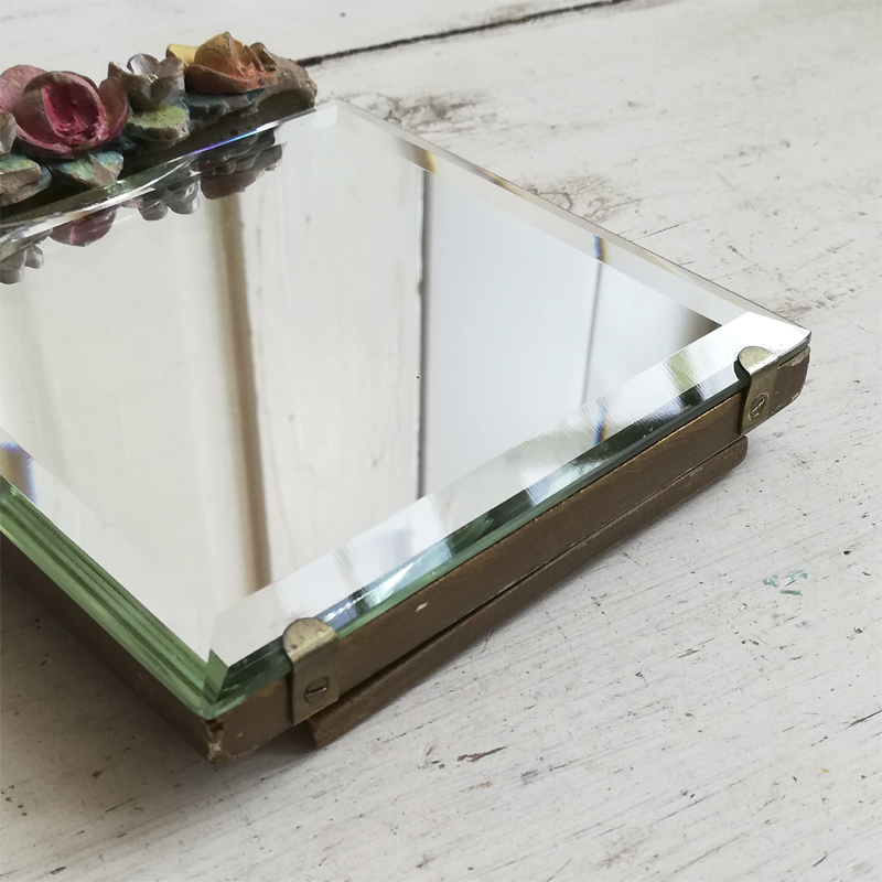 面取りされた厚みのある鏡は木製の板にセットされています。