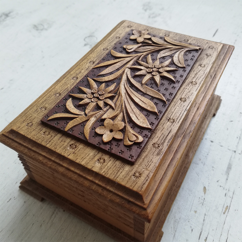 こちらは蓋にスイスの国花エーデルワイスの木彫や表面にもノミによる細かな彫りがあり表情豊かです。