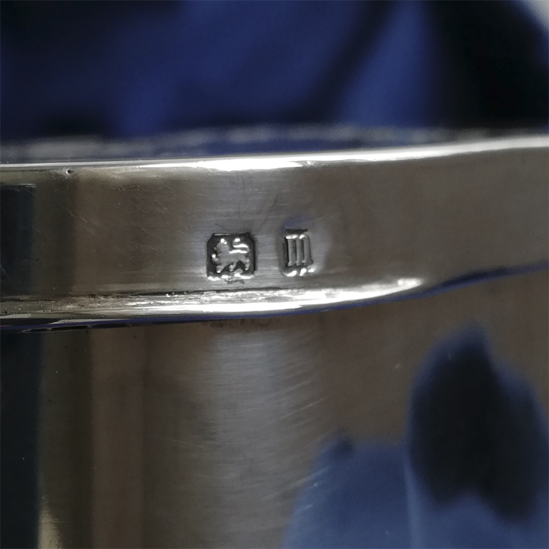 蓋にスタンダードマークと1911年のデイトレター、本体にメーカーズマーク、バーミンガムのアセイオフィスマーク、スタンダードマーク、1911年のデイトレターのホールマークがあります。
