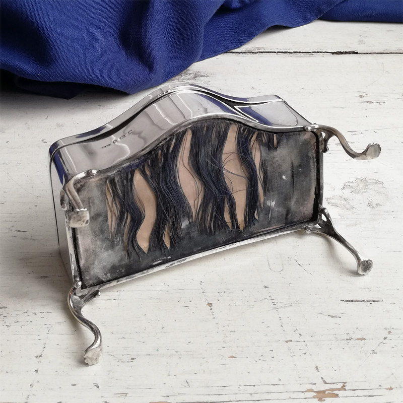 まるでミニチュア家具のようなシェイプとライオン脚を持つシルバー製のジュエリーボックスです。