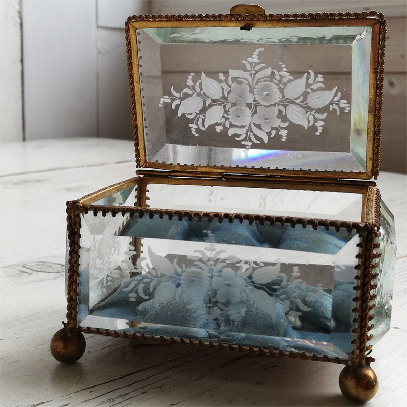 底以外の5面を厚みのある面取りガラスで囲んだフランスのジュエリーボックスです。