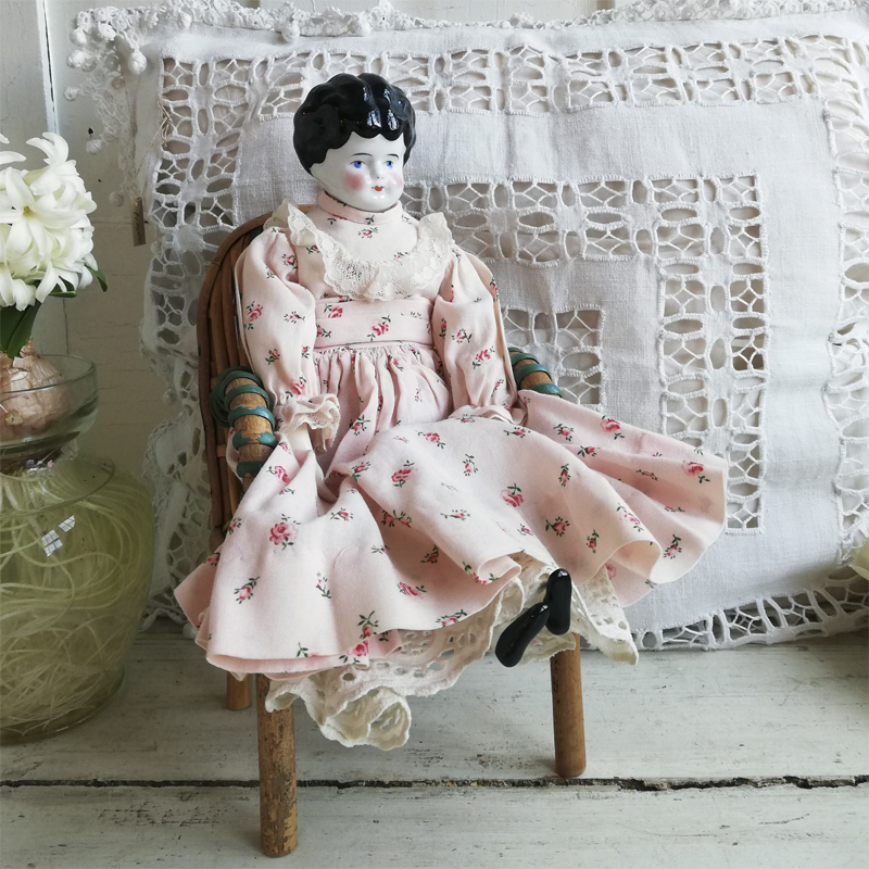 白磁のフェイスに青い目、赤い口、赤く染まった頬などバランス良く目鼻口が描かれた綺麗な顔立ちのチャイナヘッドドールです。ゴールドで描かれた襟と胸元にESTHERと名前が印されています。
