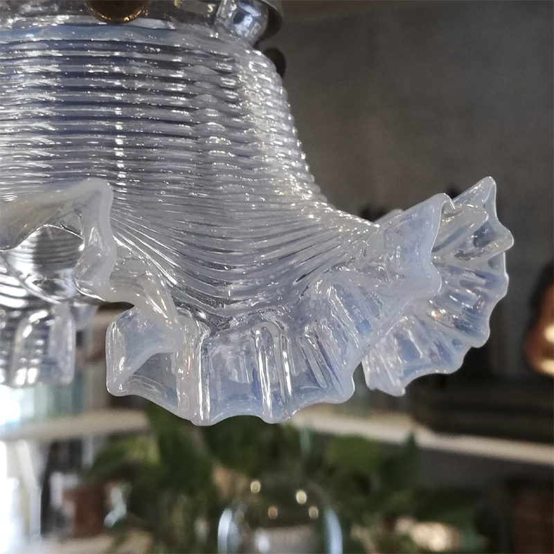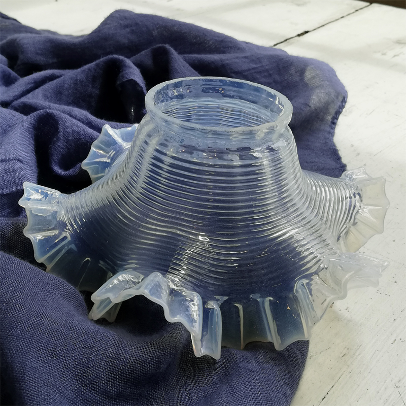 青白い乳白色が独特の雰囲気を持つオパールセントガラスのランプシェードです。