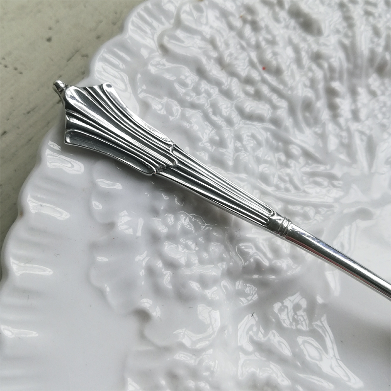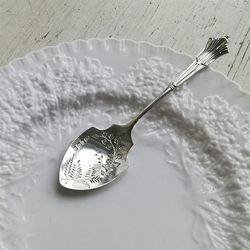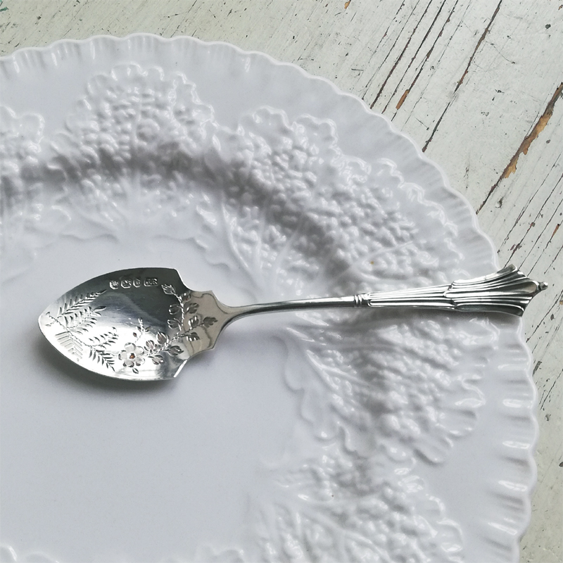 ボウル部分にワイルドローズとシダがエングレーヴィングされた純銀製のジャムスプーンです。