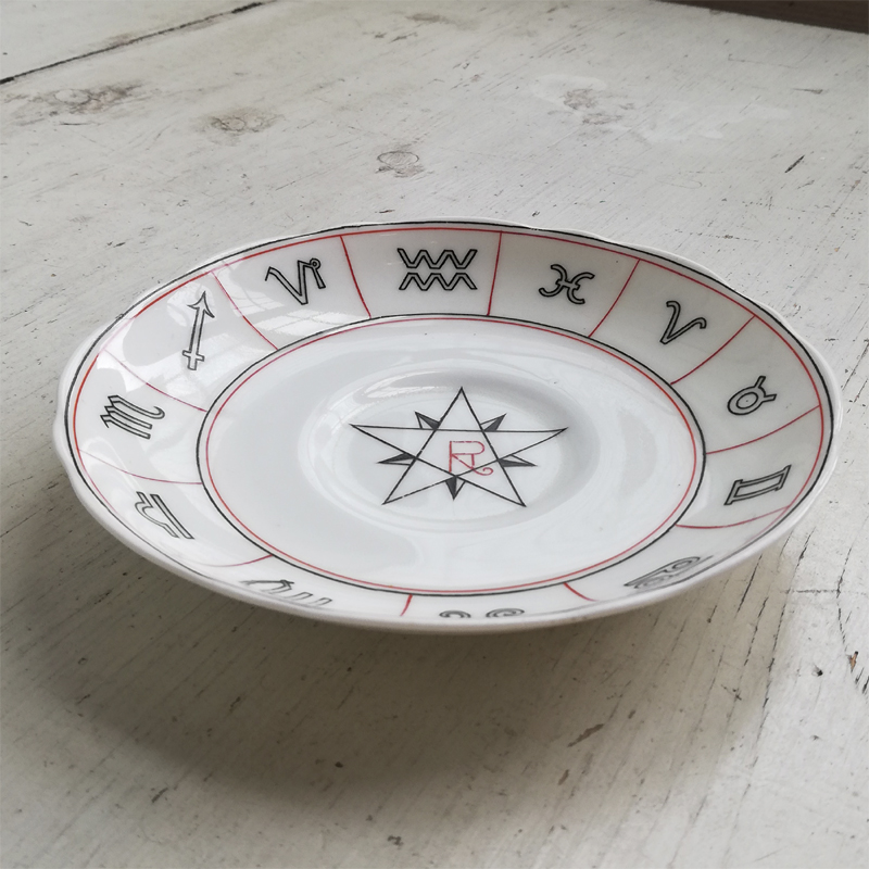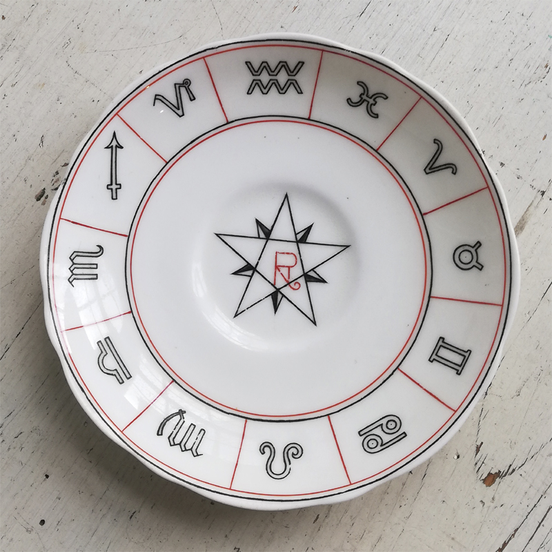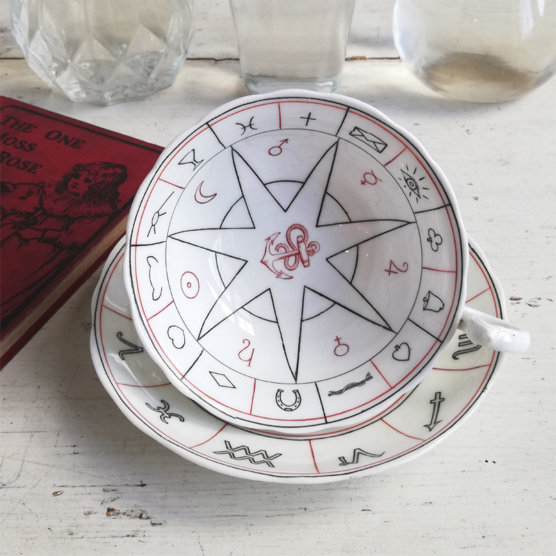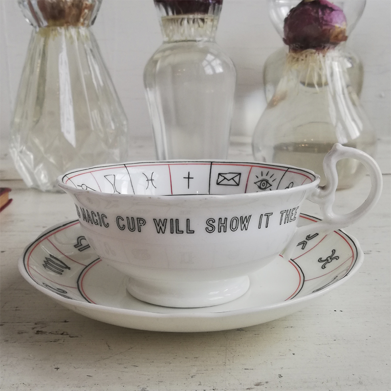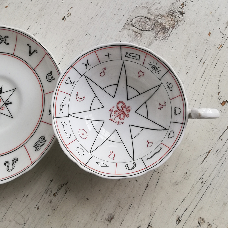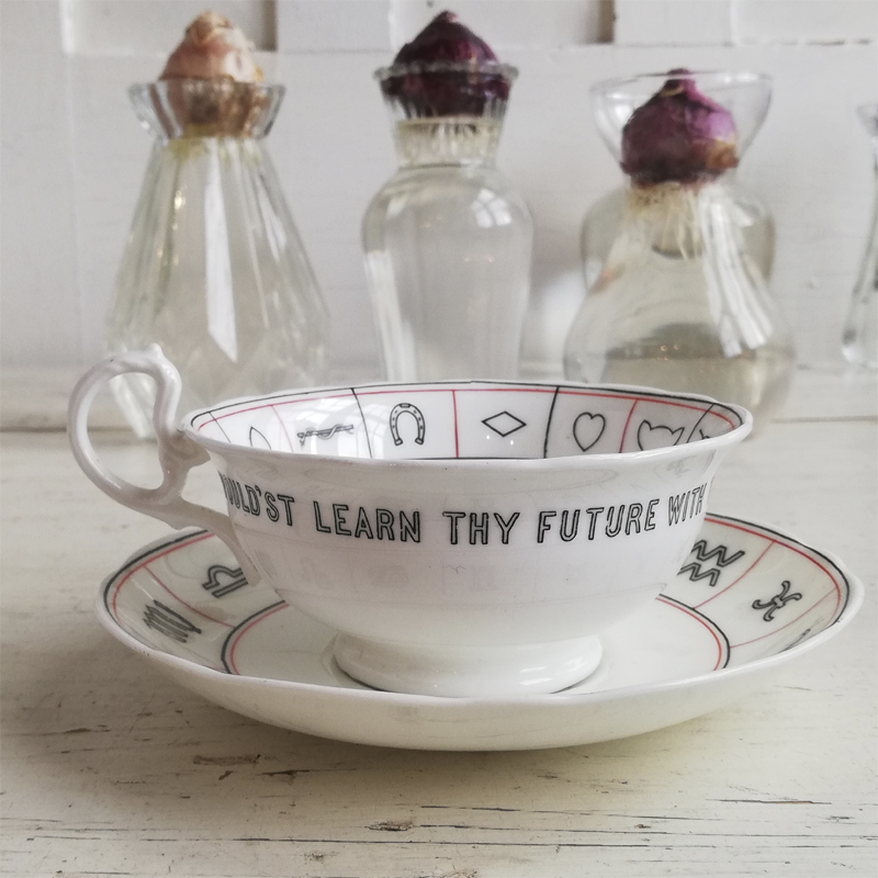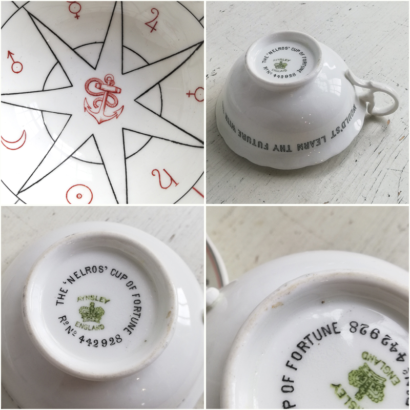 1904年に英国のデザイナー ネル・ロス女史が考案し、エインズレイにて制作された紅茶占いのカップ&ソーサーです。紅茶占いとはティーカップに残った茶葉の形や位置で未来を占う、19世紀の英国で楽しまれた遊びです。