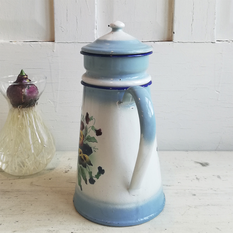 白地に淡いブルーのぼかしが入ったホーローのコーヒーポットです。