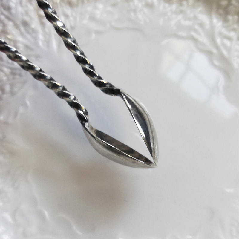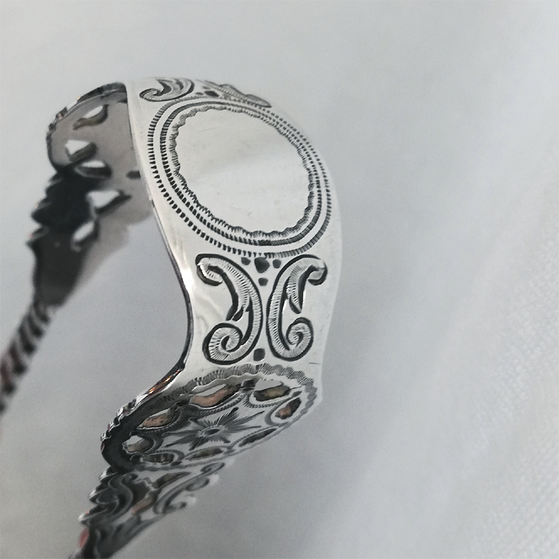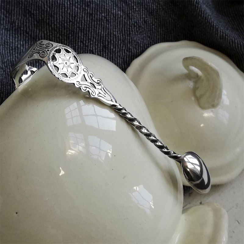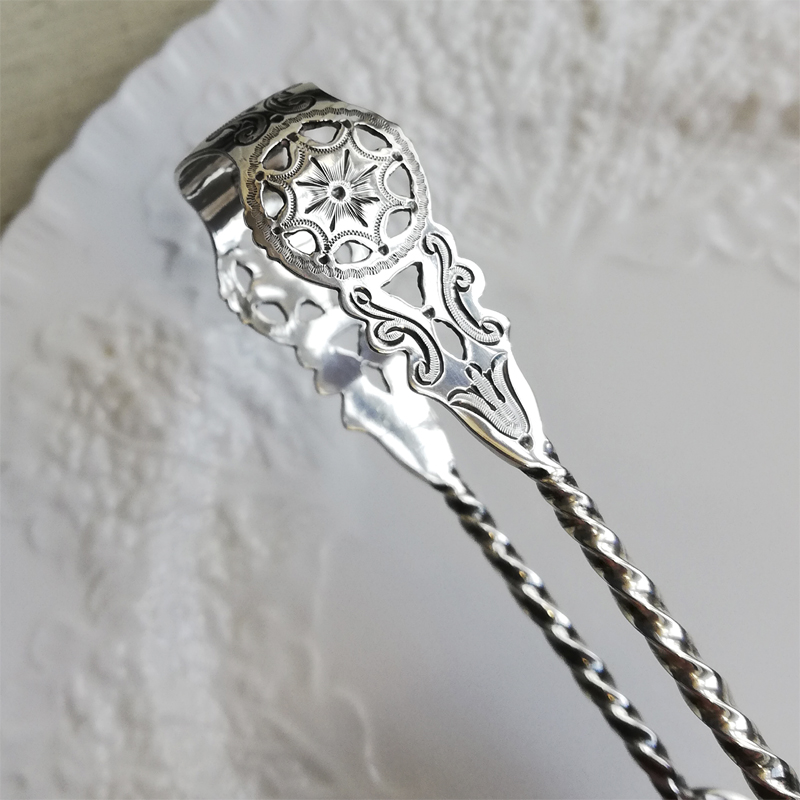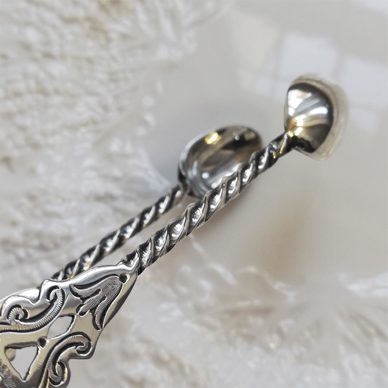 ブライトカットに透かし彫りにねじりのハンドルと小さな道具の中に手の込んだ職人技が息づくシュガートングです。当時のお茶の時間がいかに貴重で大切だったのかを感じます。