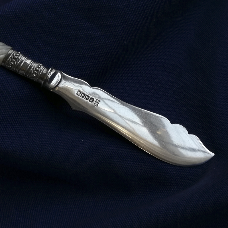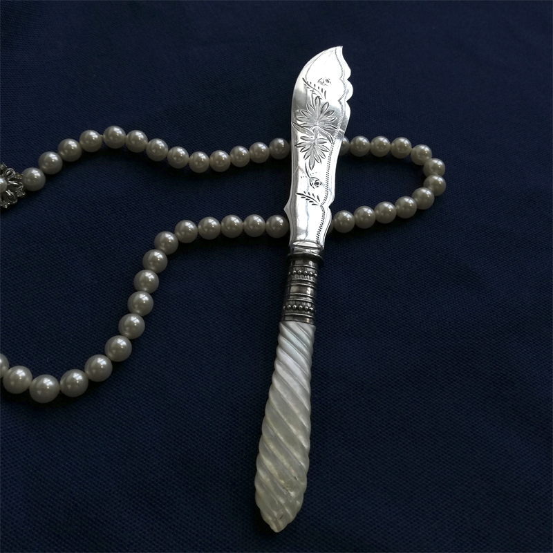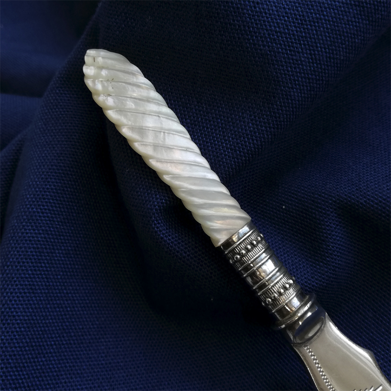 乳白色に輝くマザーオブパール(白蝶貝)のハンドルが美しいクラシカルなバターナイフです。