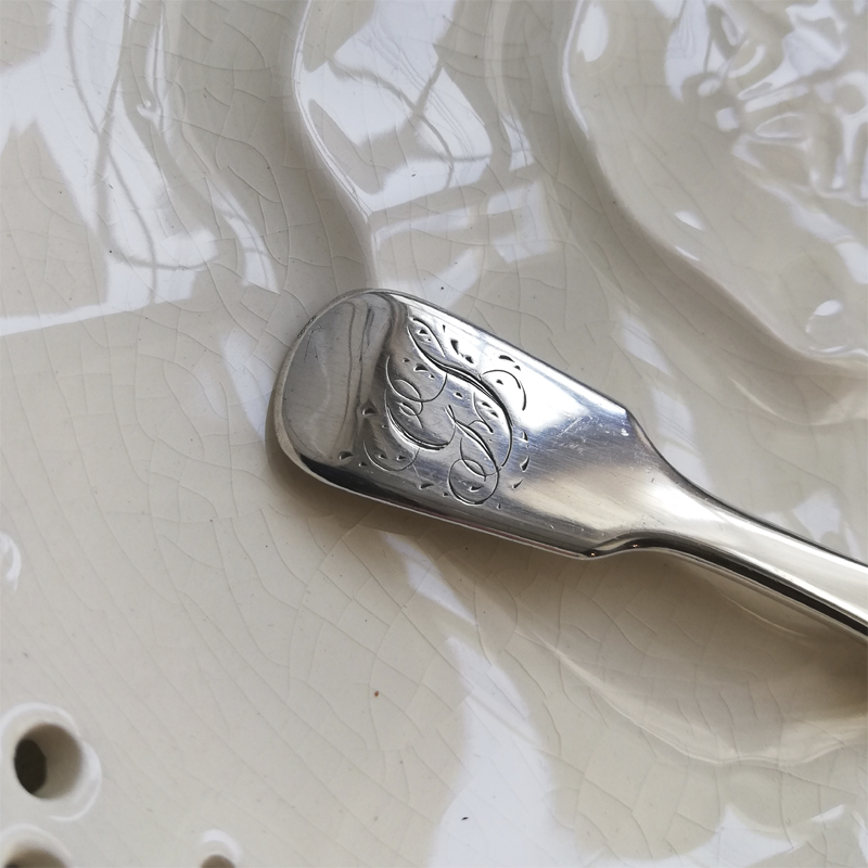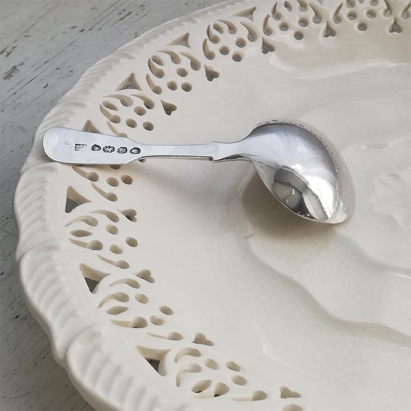 ハンドルの裏面にJohn, Henry & Charles Liasの工房マーク、ロンドンのアセイオフィスマーク、スタンダードマーク、1836年のデイトレター、ウィリアム4世のデューティーマークのフルホールマーク入りです。