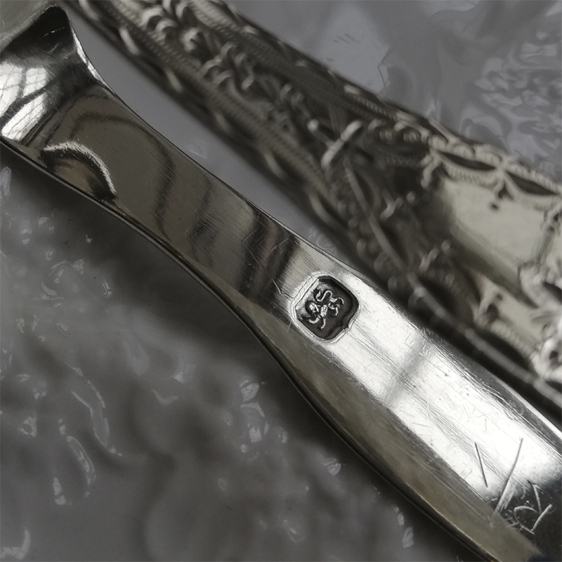 買い付け時に銀器ばかりを扱うデイーラーから、ロンドンのメーカーで1780年代頃のものと聞いております。