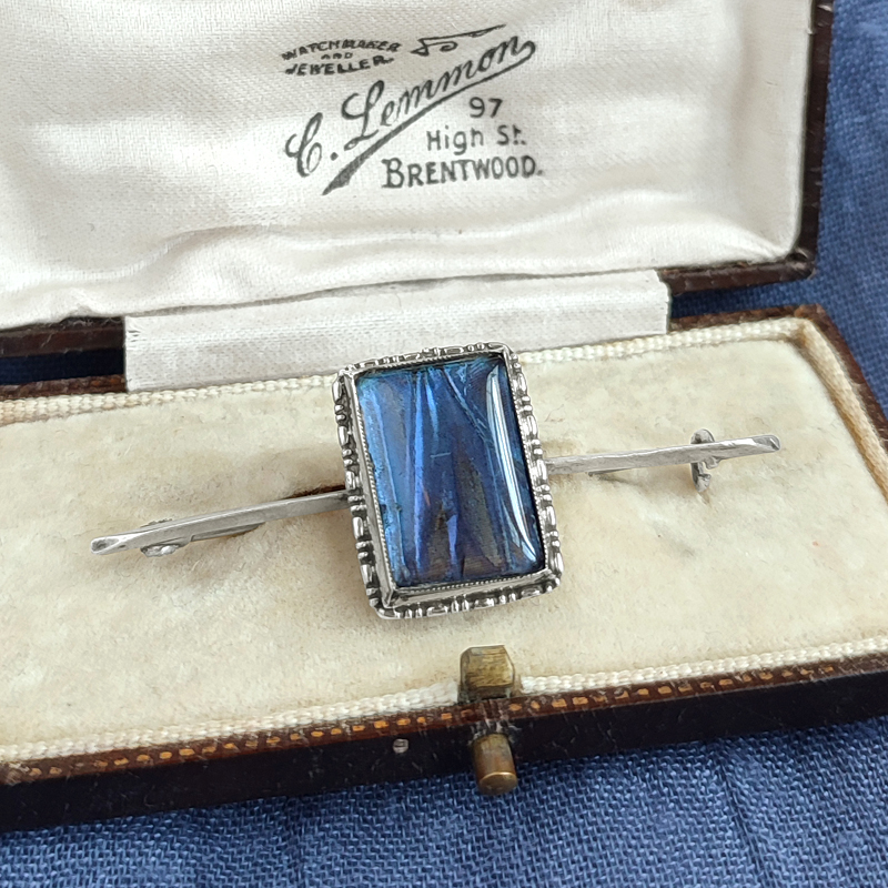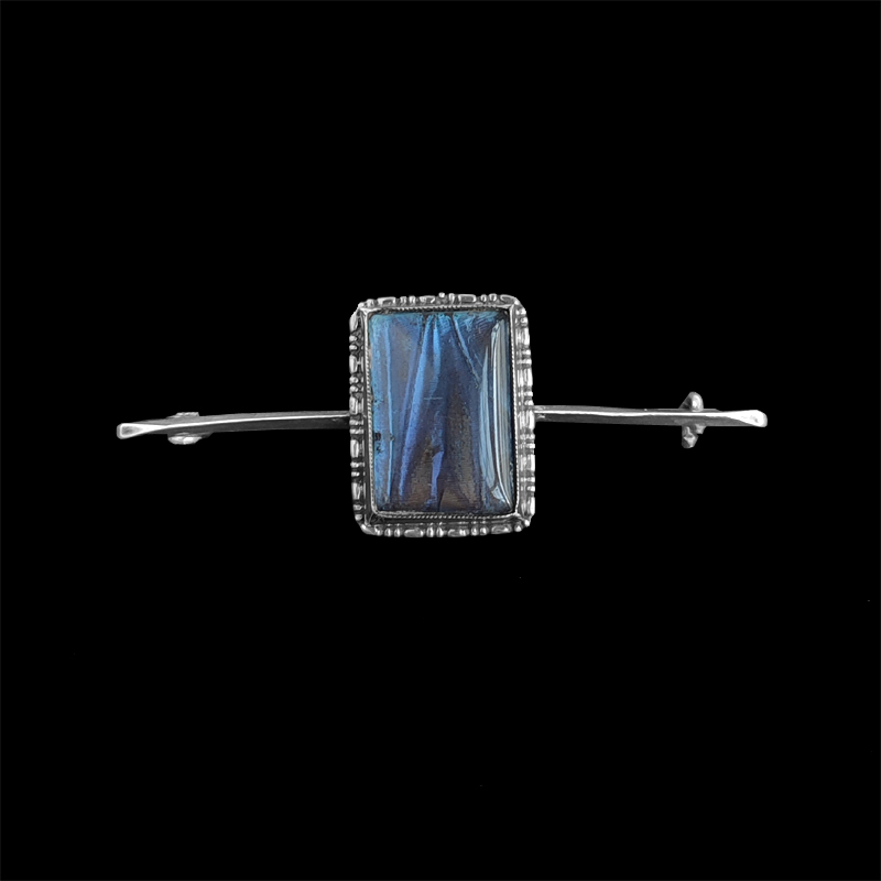 神秘的な魅力のあるモルフォ蝶の翅を用いた、アンティークのバーブローチです。