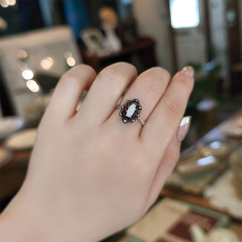 深みのある赤が印象的なガーネットと乳白色のオパールが柔らかな光を与える、コントラストの美しいリング。