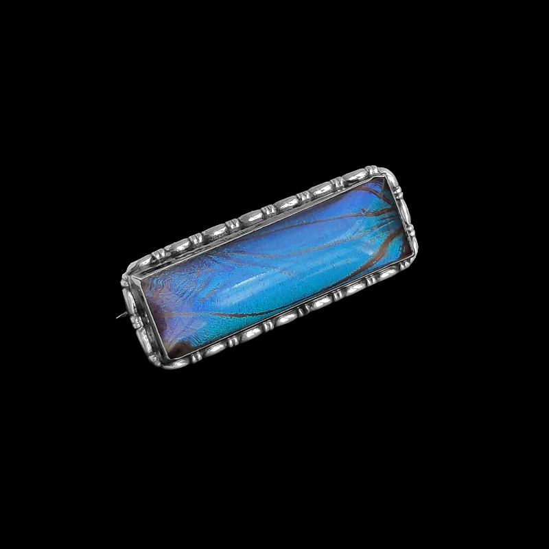 たっぷり厚みをとったドーム型のガラスに蝶の翅(ハネ)を閉じ込めたブローチ。