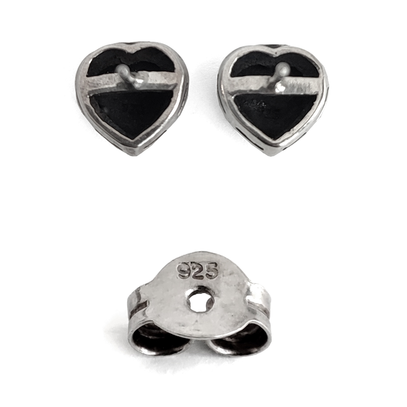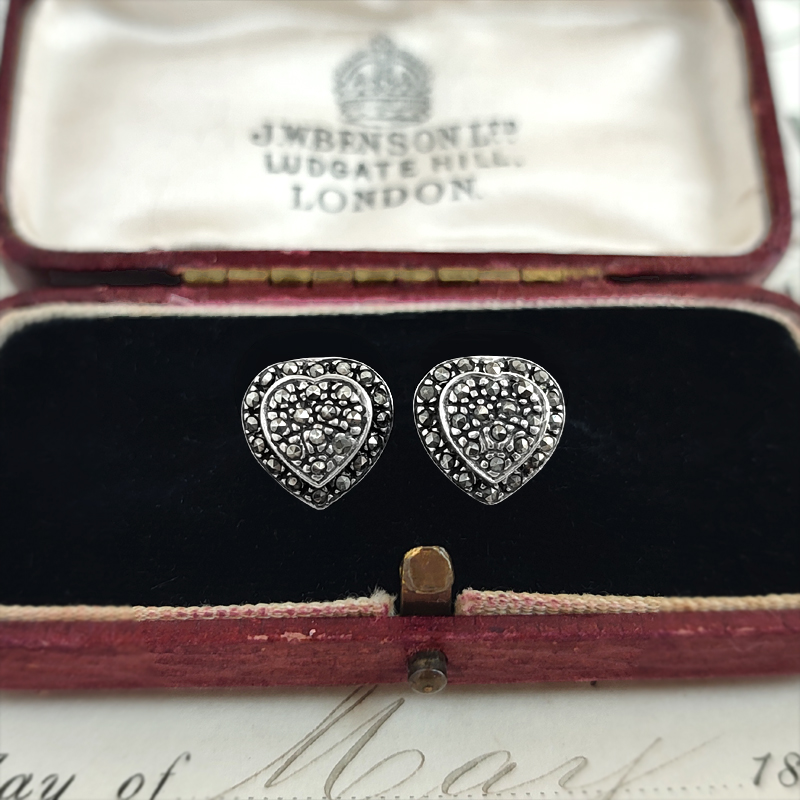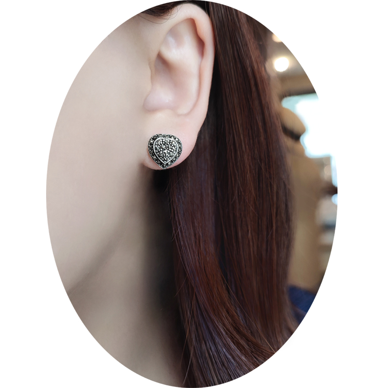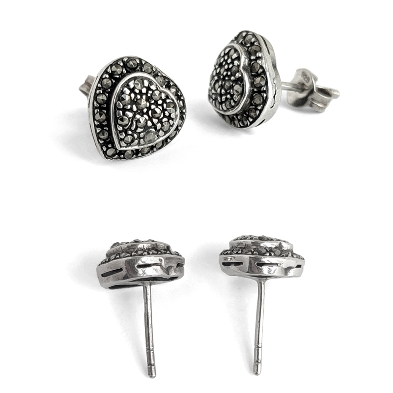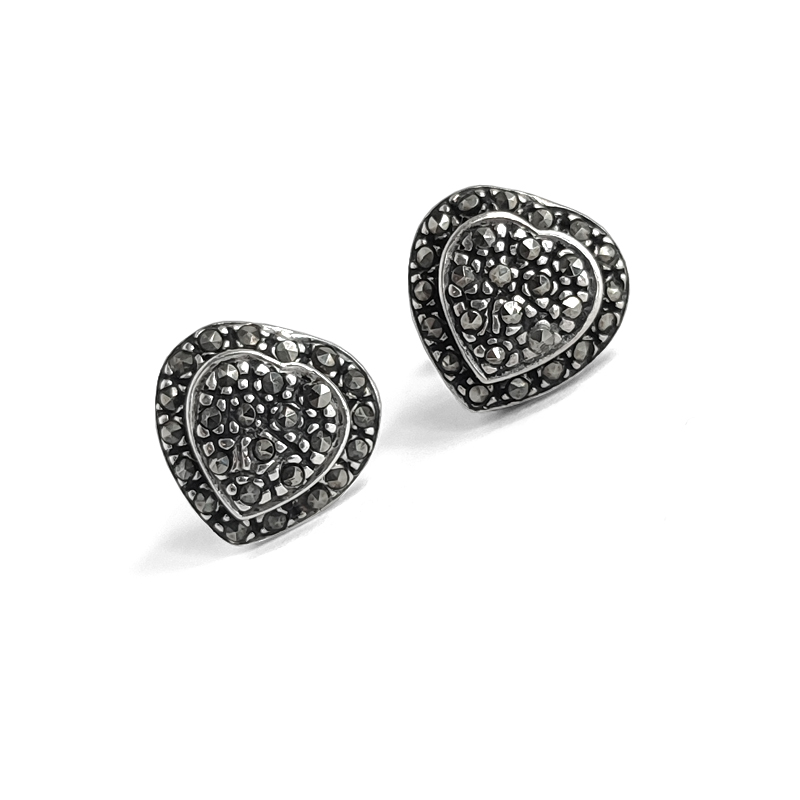 ハート型に模ったシルバーの台座にマーカサイトが敷き詰められたピアス。