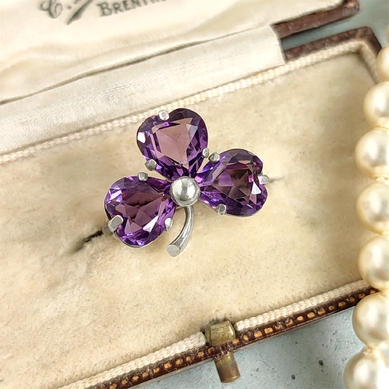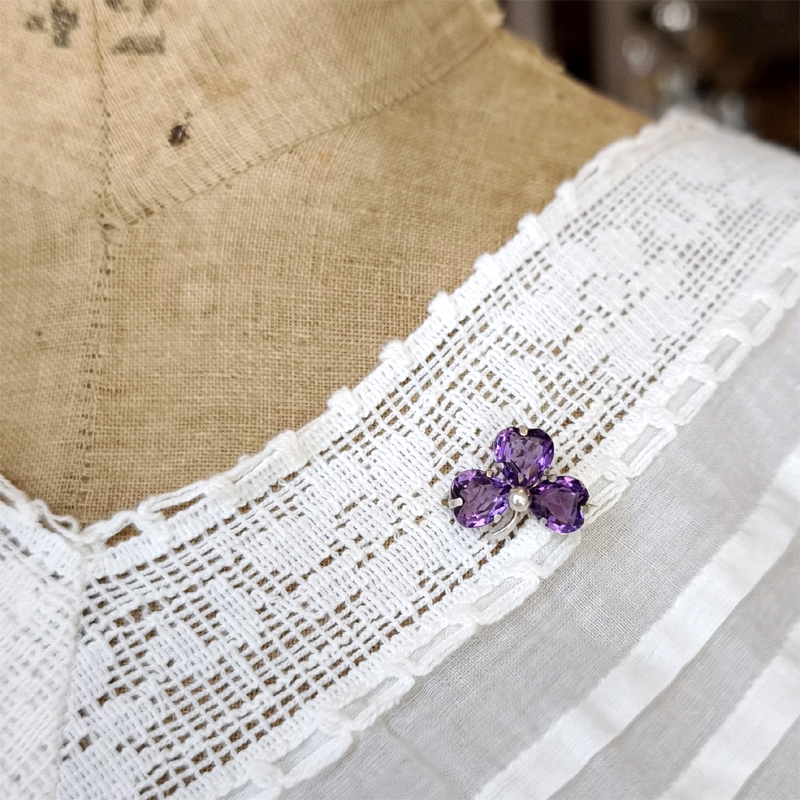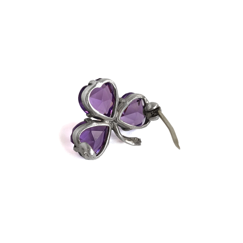 鮮やかなアメジストカラーのガラスをハート型ににカットし、クローバーリーフを表現しています。