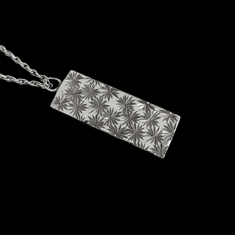 少し厚みのあるバータイプのペンダントトップに刻印が入ったネックレス。