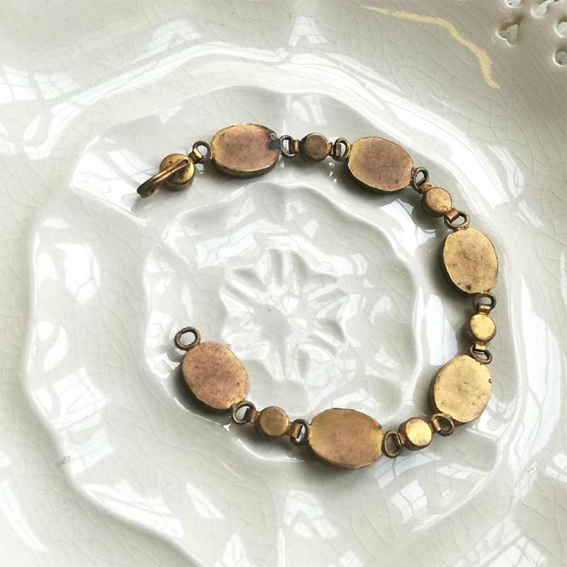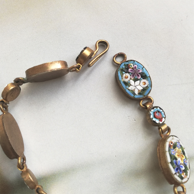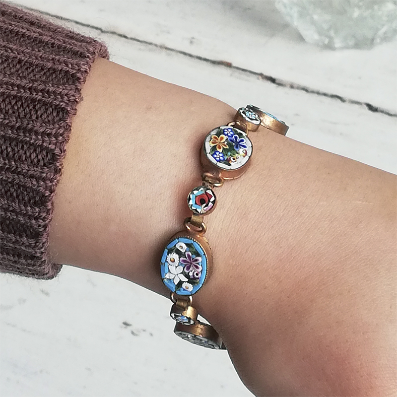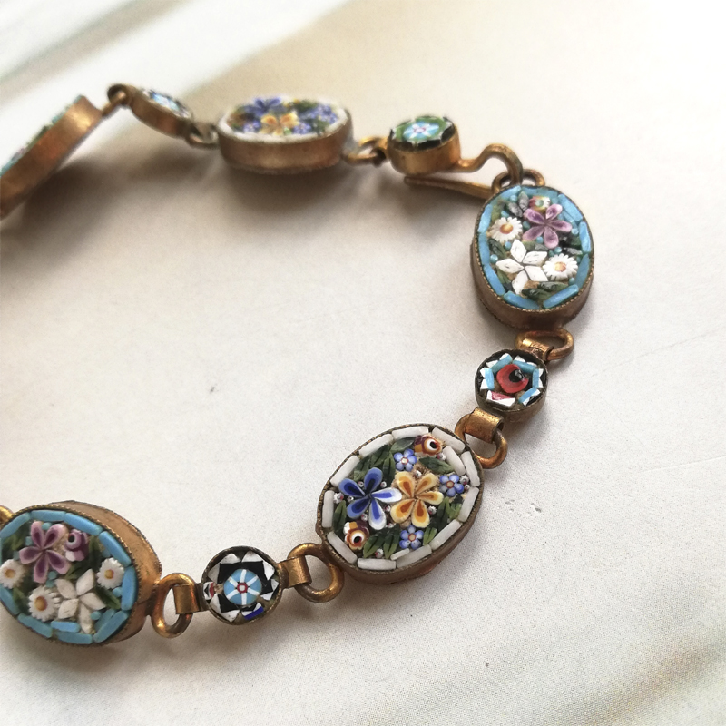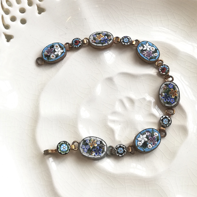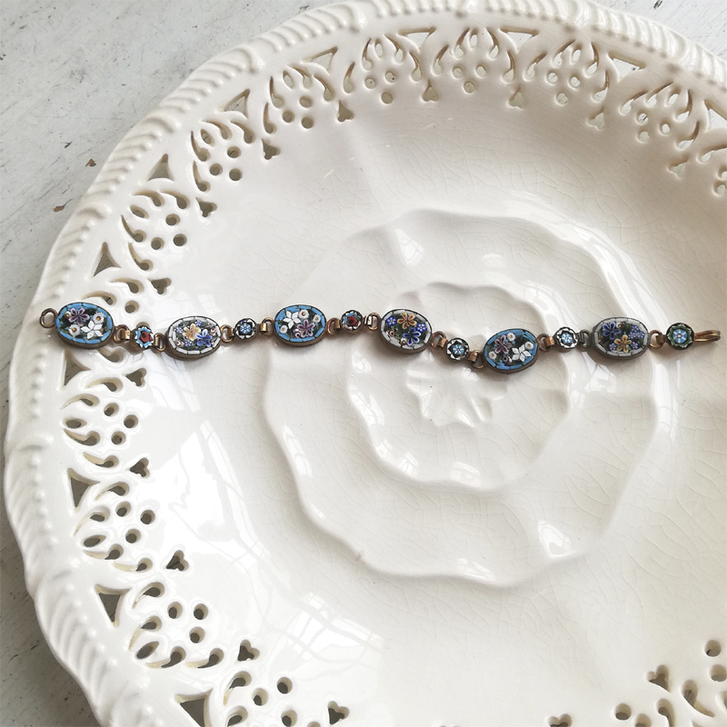 ブルーベースの楕円とホワイトベースの楕円のパーツが交互に、その合間に小さな円のパーツが連なったマイクロモザイクのブレスレットです。