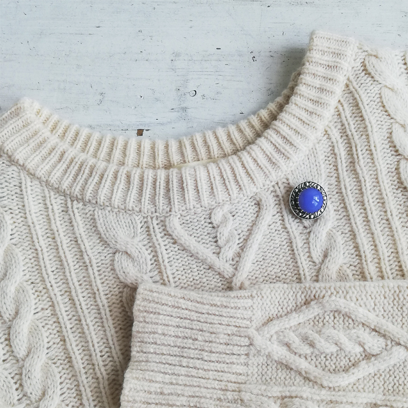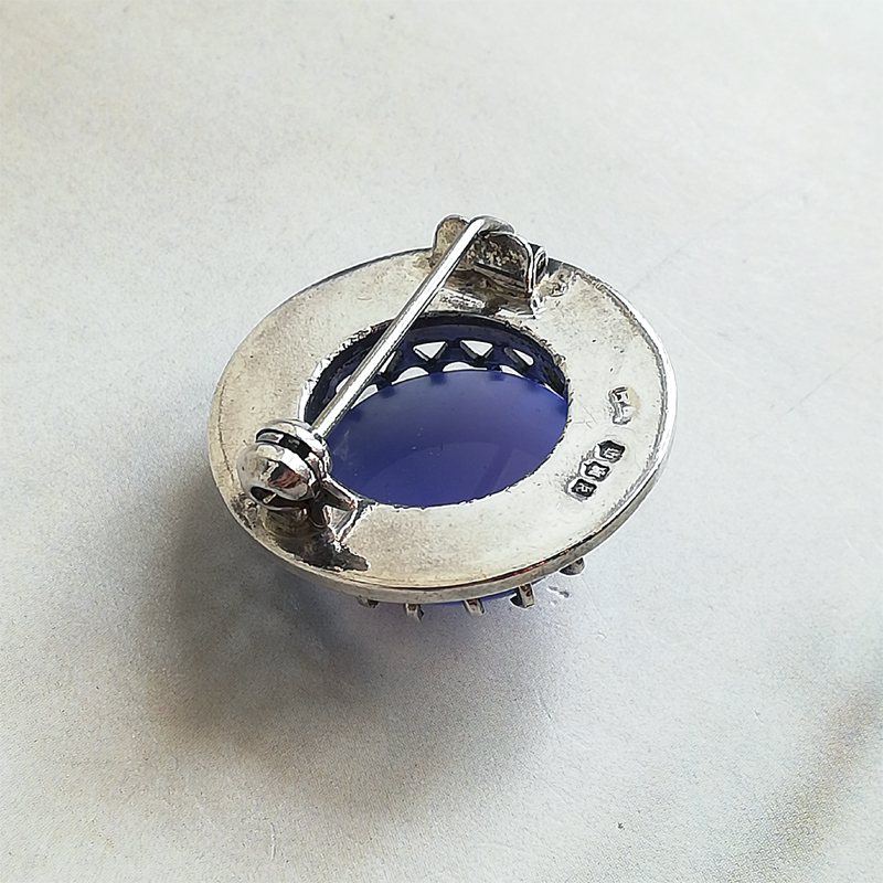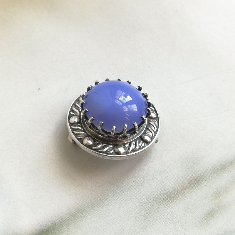 少しミルキーなブルーのカルセドニーのカボションをしっかり爪で囲ったブローチです。