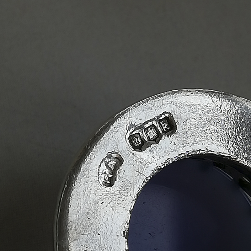 裏面にメーカーズマーク、スコットランドのアザミのスタンダードマーク、エディンバラのアセイオフィスマーク、1965年のデートレターのホールマーク入りです。
