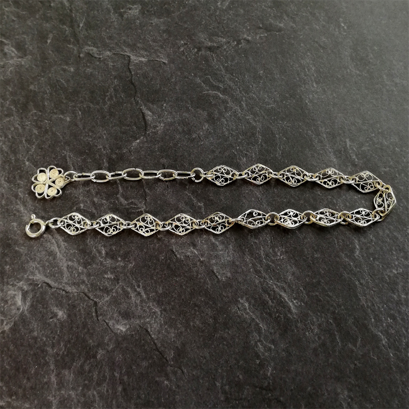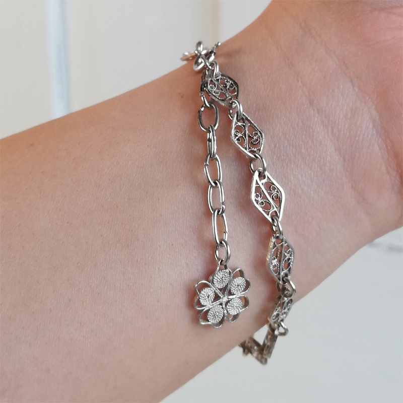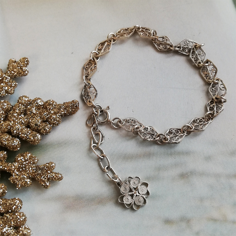 アジャスターチェーンの先に付いたチャームが揺れるフィリグリー(銀泉細工)のブレスレットです。