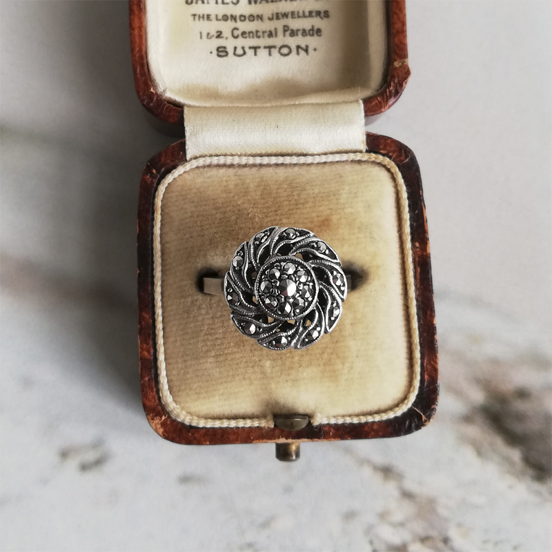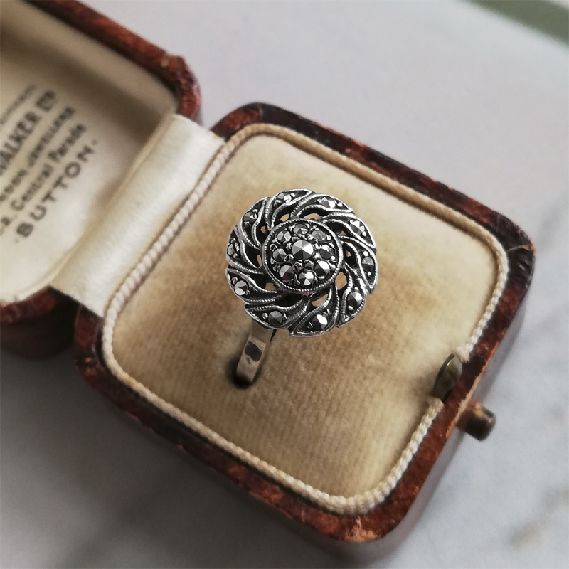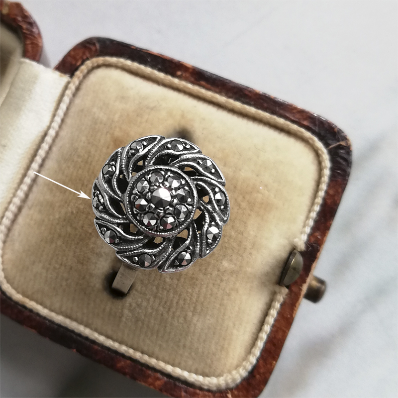 小さなマーカサイトが使われたシルバーリングはフランスから。