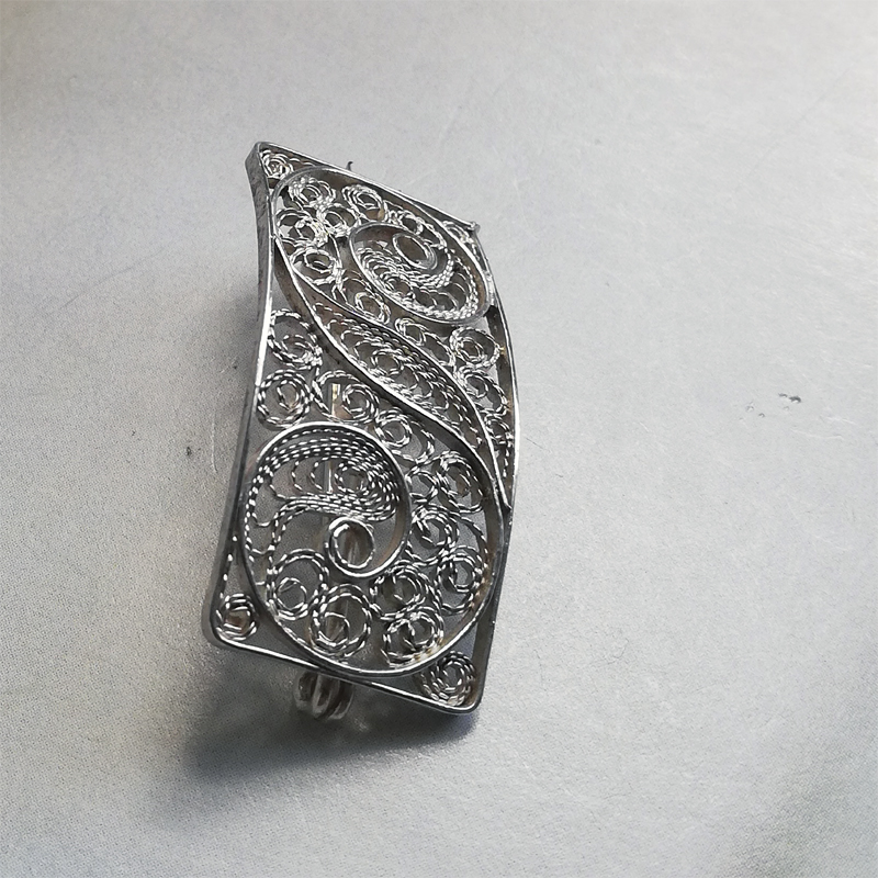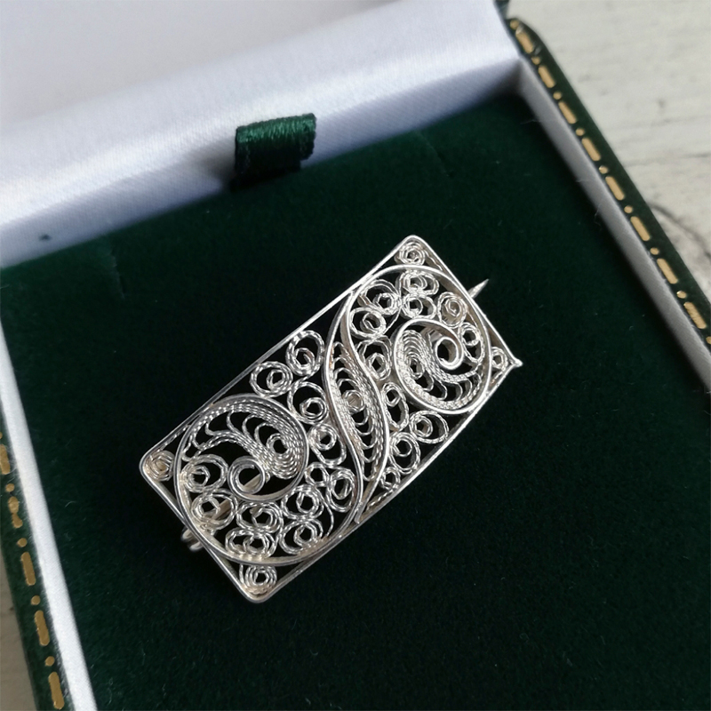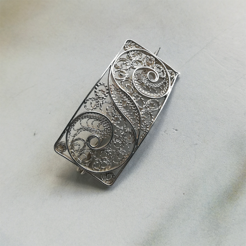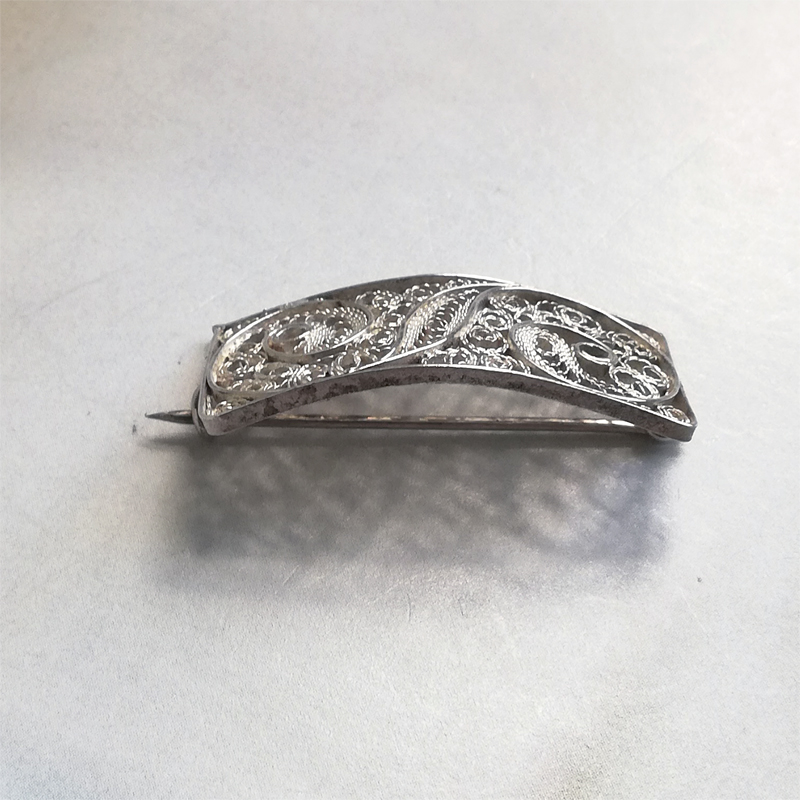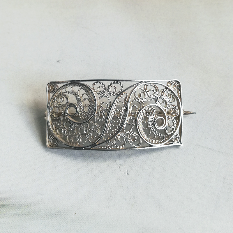 少しカーブを描いたレクタングルのフィリグリーブローチ。