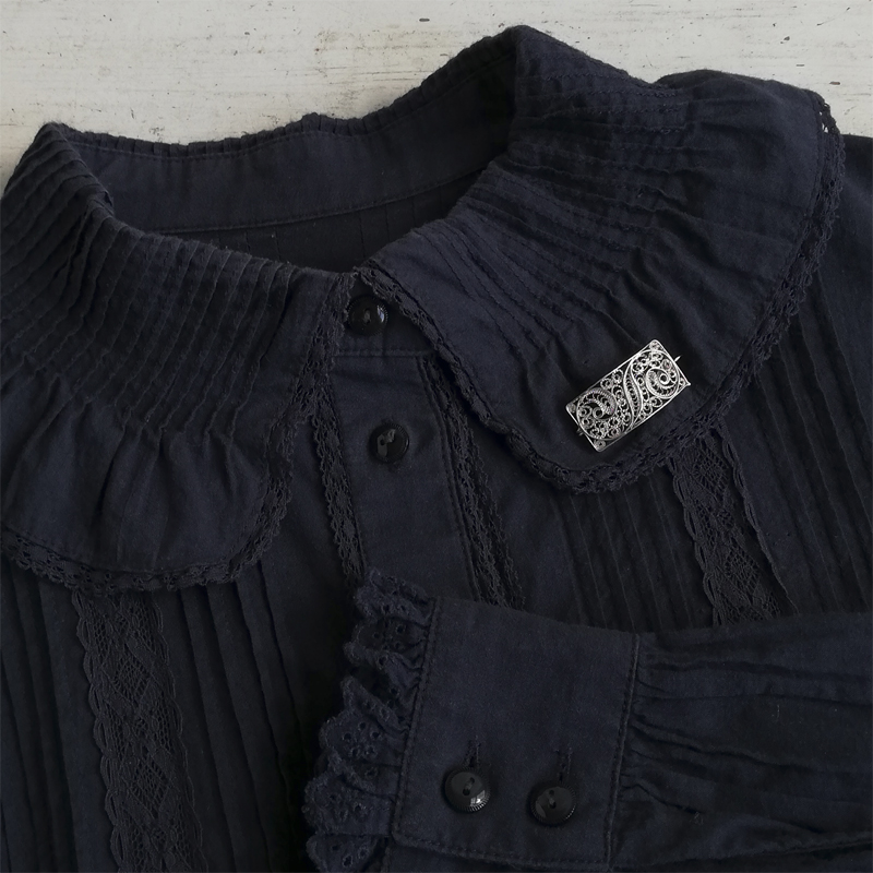小ぶりながら存在感があり、襟元やストール留め、帽子などのアクセントにもお薦めです。