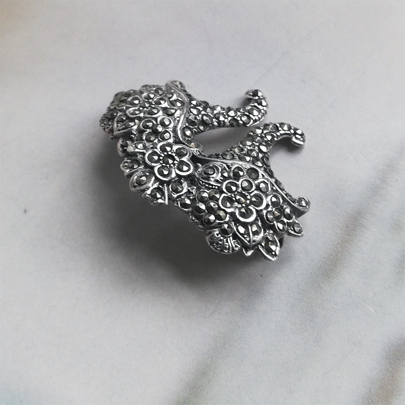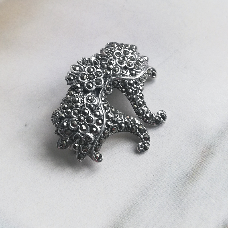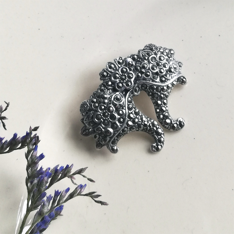 スターリングシルバーのマーカサイトが隙間なくセットされ、2つの花かごが寄り添ったようなブローチです。
