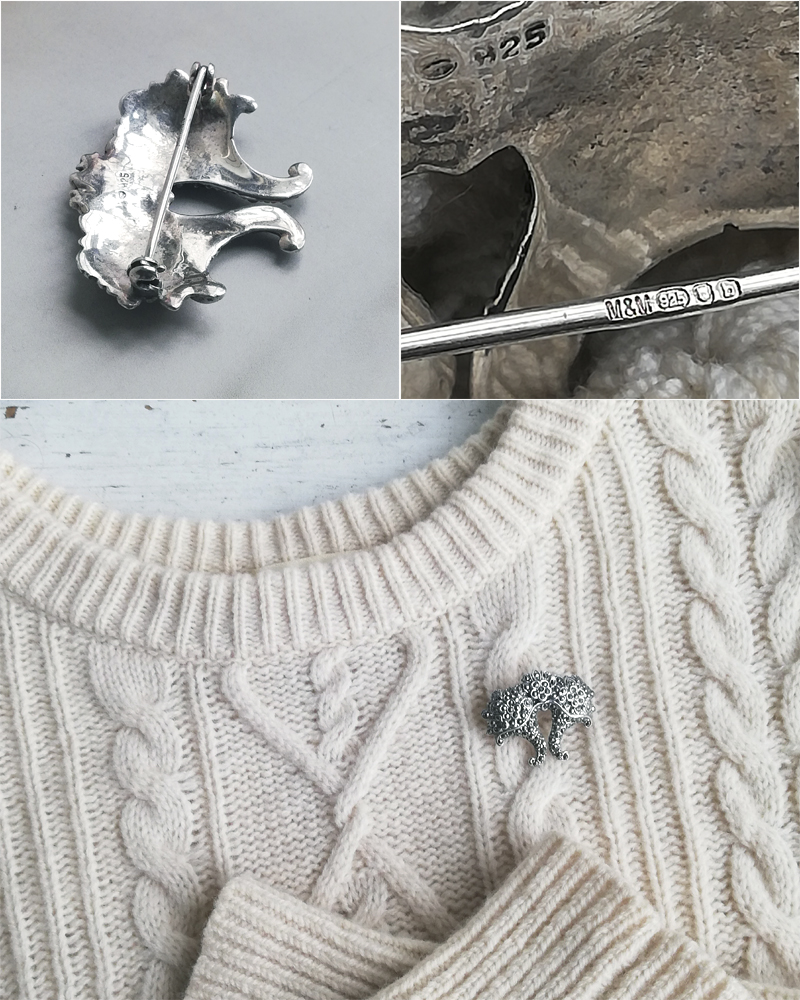 裏面に925の刻印とピンにメーカーズマーク、925、ロンドンのアセイオフィスマーク、2001年のデイトレターのホールマークがあります。