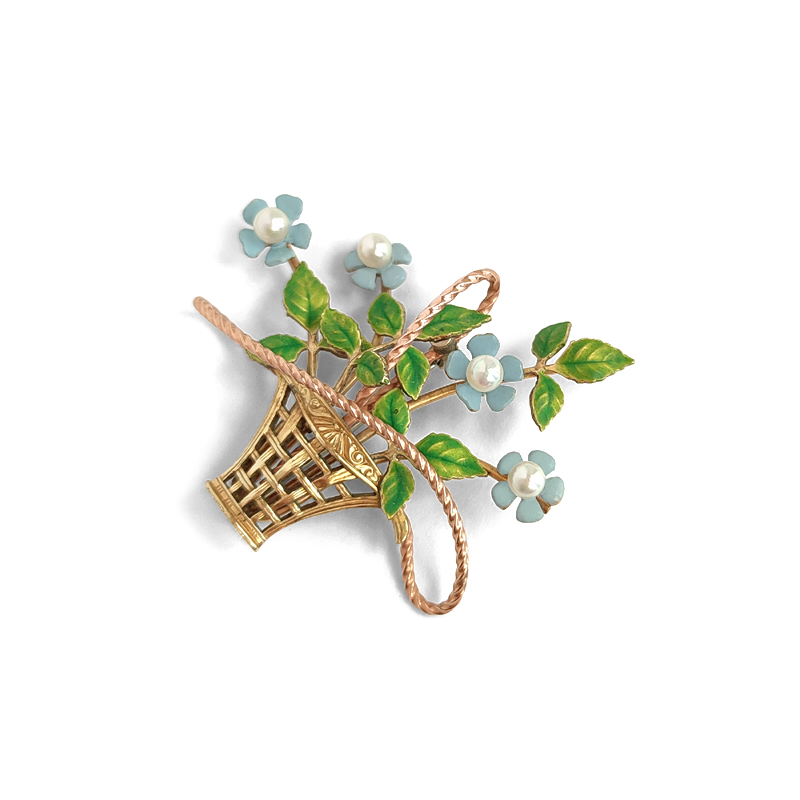 繊細なエナメルで表現された淡いブルーの花びらと、やわらかなグリーンの葉が瑞々しい印象です。