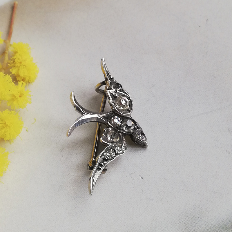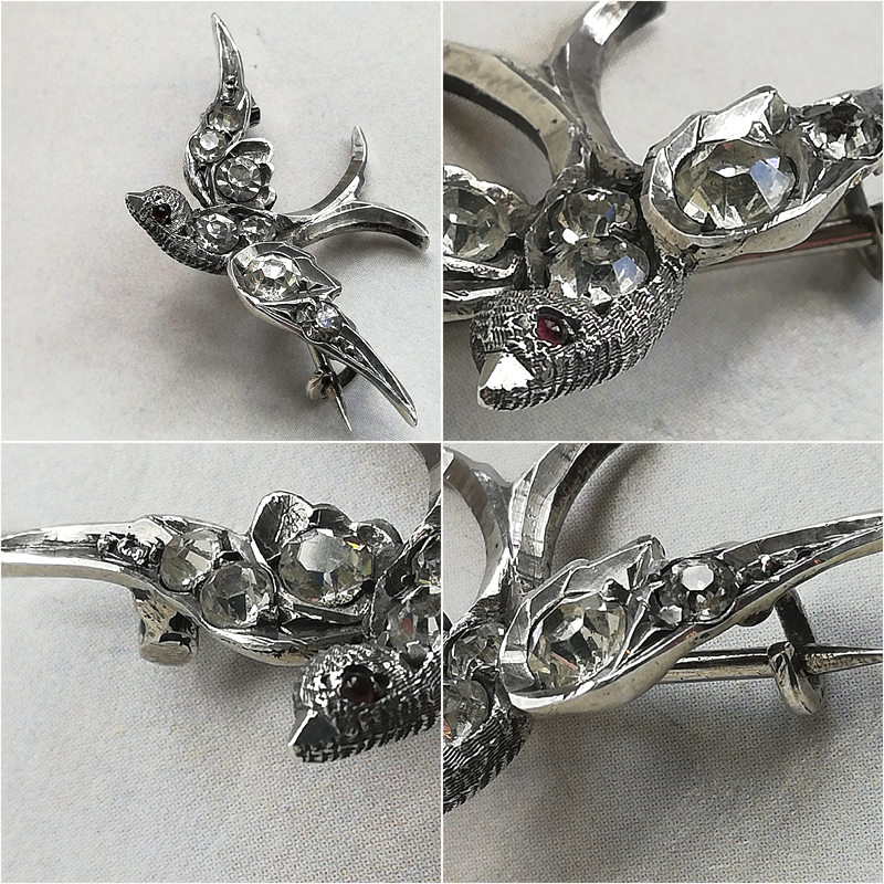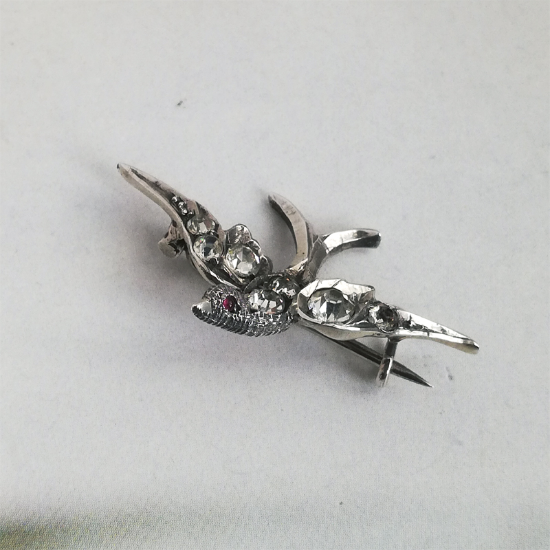 片側にレッドグラスアイを持つスターリングシルバーのツバメのブローチです。