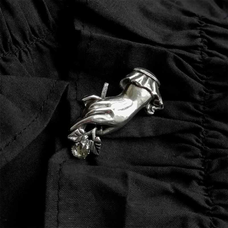 しなやかな手元に一輪の薔薇をそっと携えたロマンティックなヴィクトリアンハンドのブローチです。
