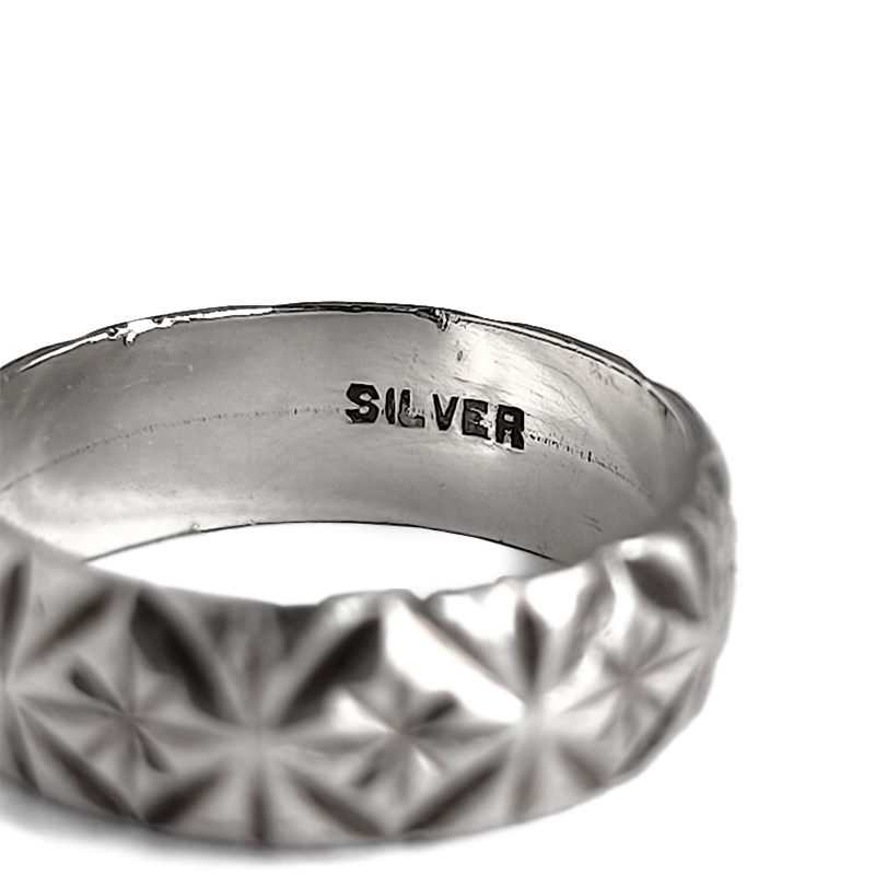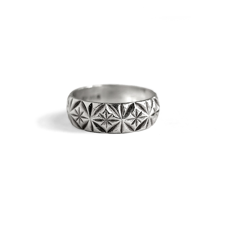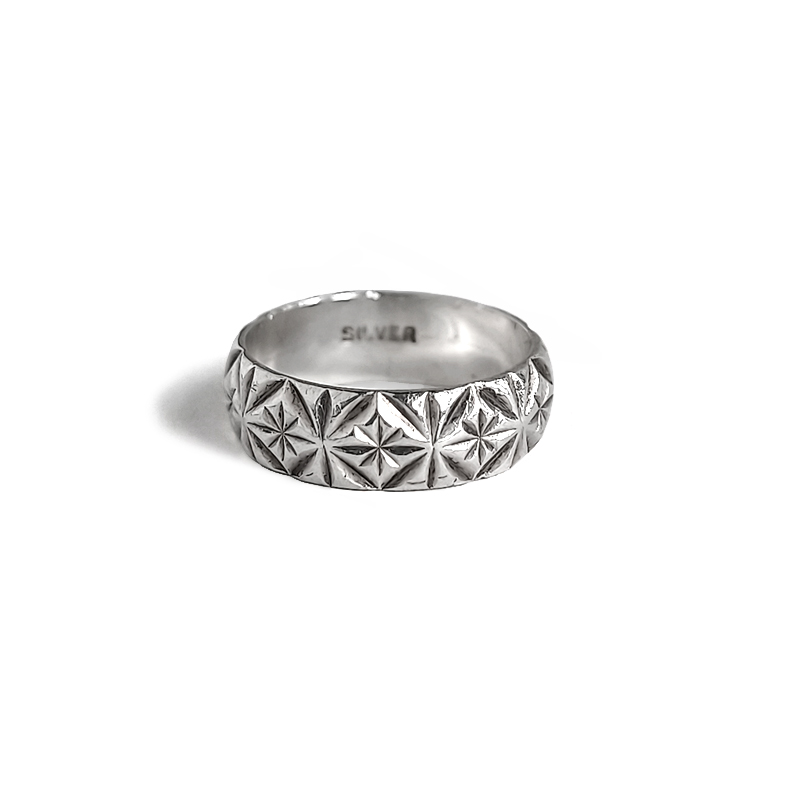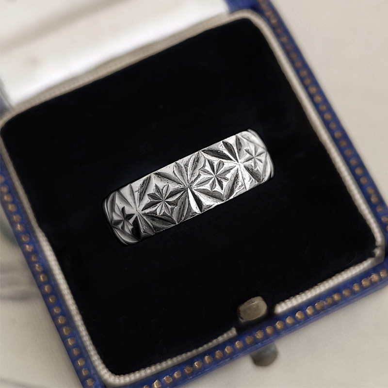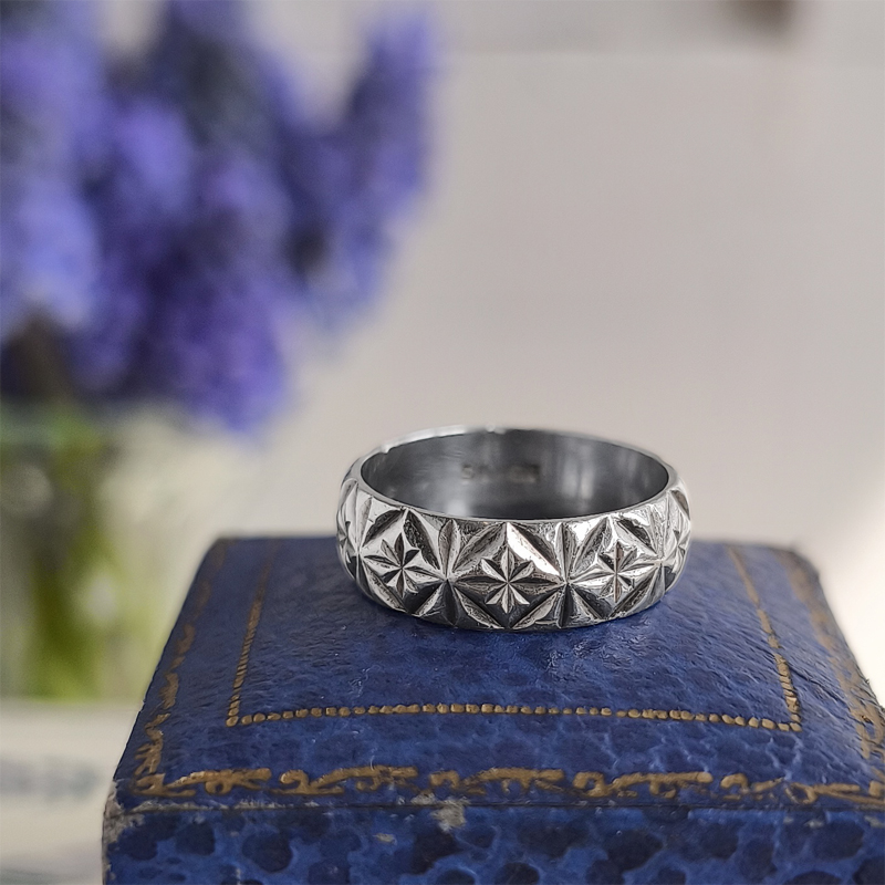 繊細な彫刻がぐるりと刻まれた、ヴィンテージのシルバーリング。
