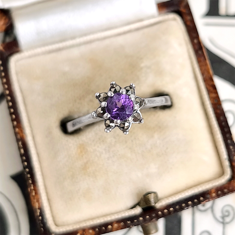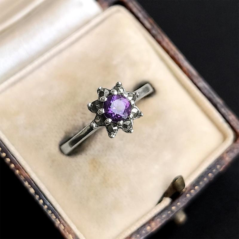アメジストは爪留めされ石座に高さを出し、その一段下にマーカサイトが配置され、ボリューム感と立体感が出るように仕上げられています。