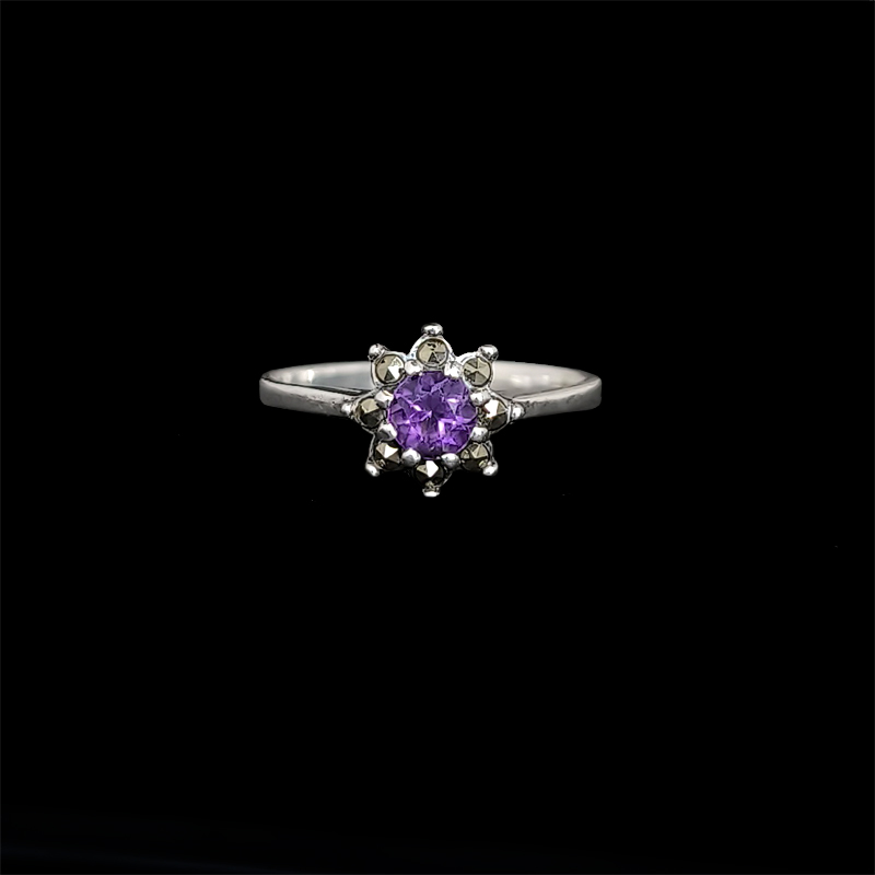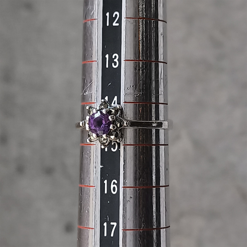 アメジストを中心に、繊細な輝きを添えるマーカサイトをセットしたシルバーリング。 異なる輝きを持つストーンが組み合わさることで、八芒星を象るデザインです。